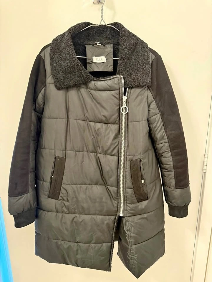 Stylish black winter jacket from ELLA, size Small. Perfect for current weather it’s waterproof, with a cozy sherpa-style collar and padded body for extra warmth. Size: Small. Color: Black. 100% Polyester. Warm padded design with soft collar. Functional zipper and pockets. Perfect for current climate (waterproof). Great everyday winter coat. Comfortable, warm, and easy to style.