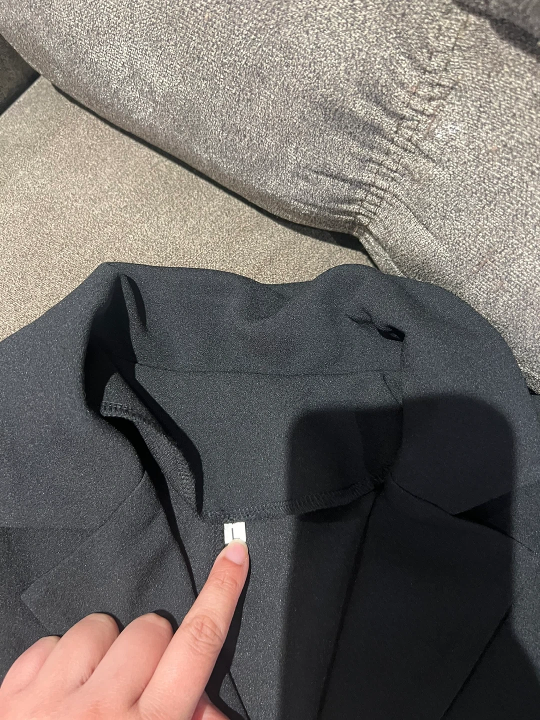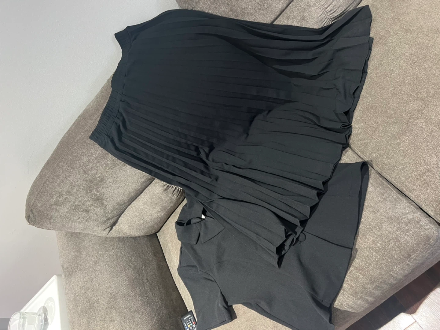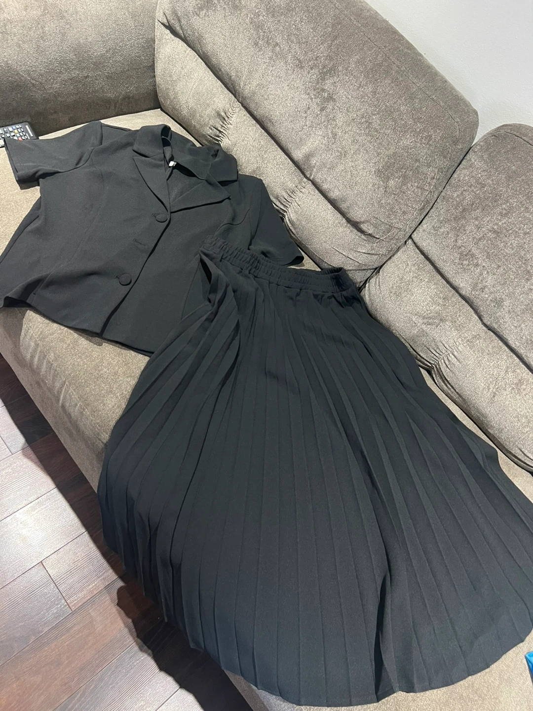 This is a size L black pleated skirt and a matching short-sleeved blazer. The skirt is made of 95% polyester and 5% spandex. It's a versatile set for many occasions!