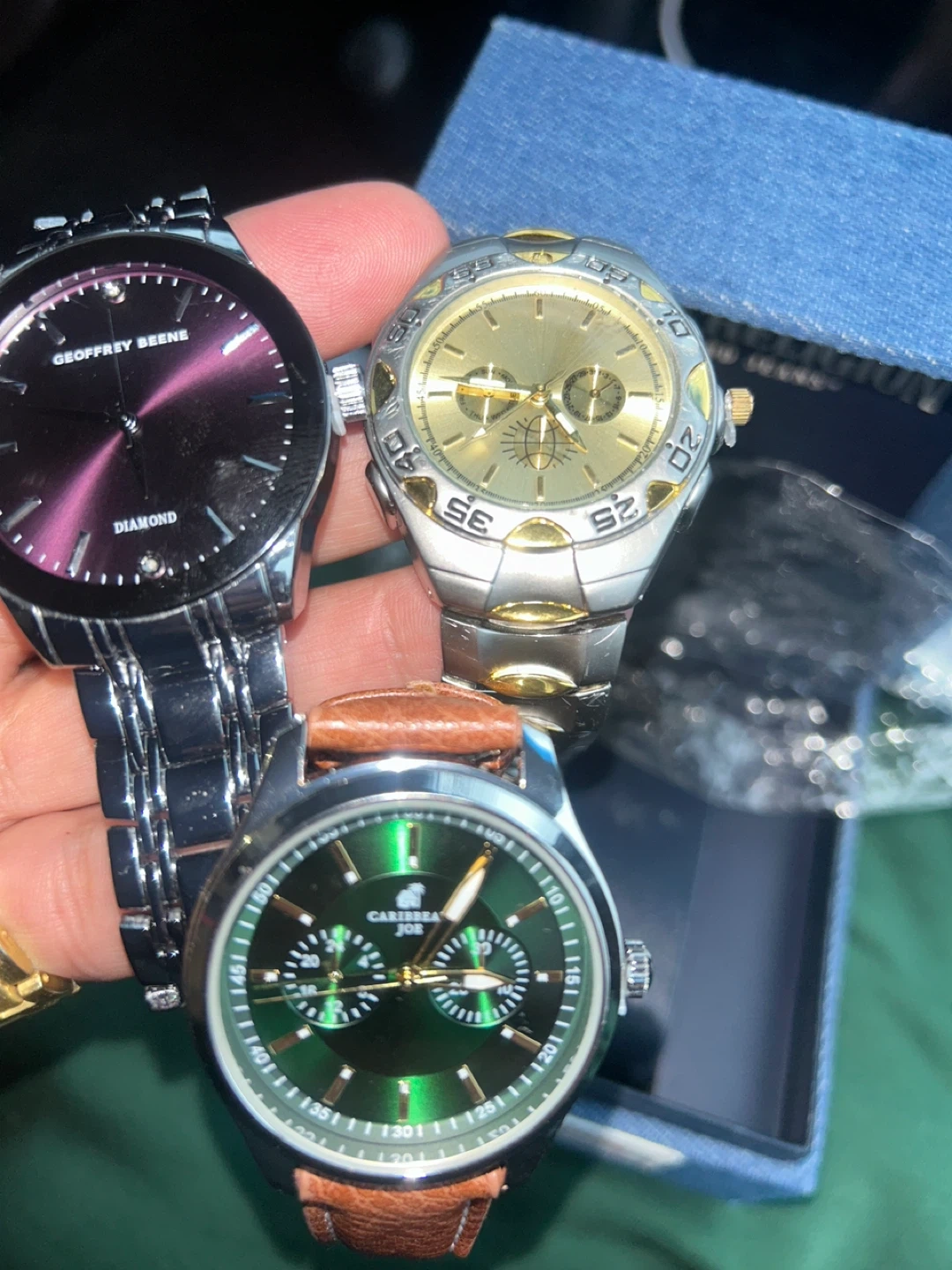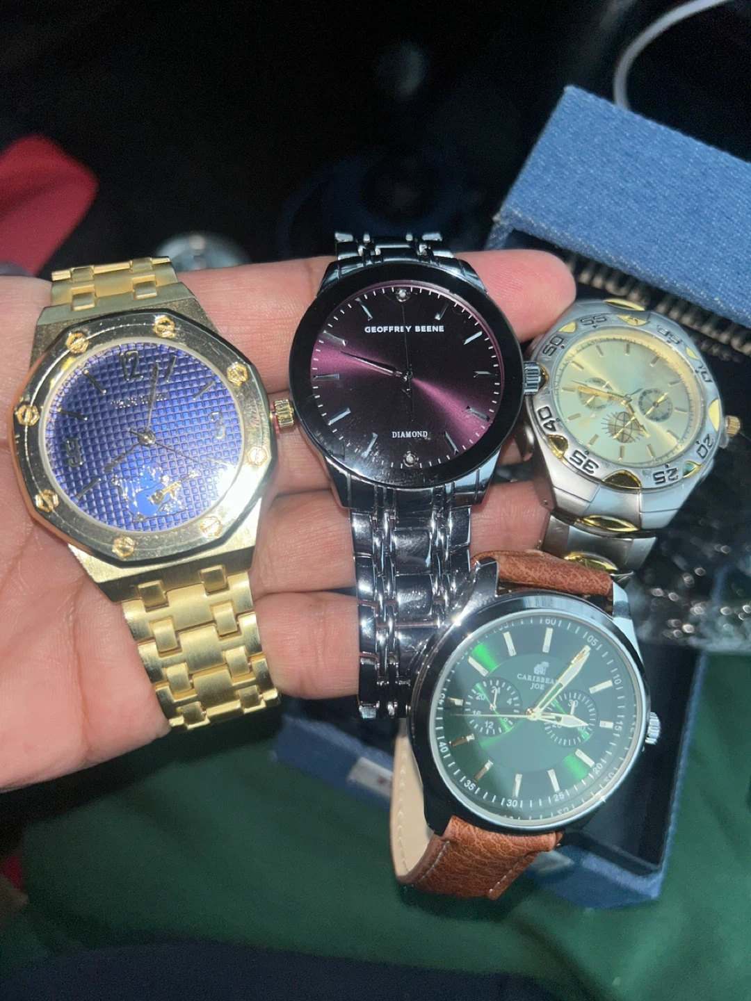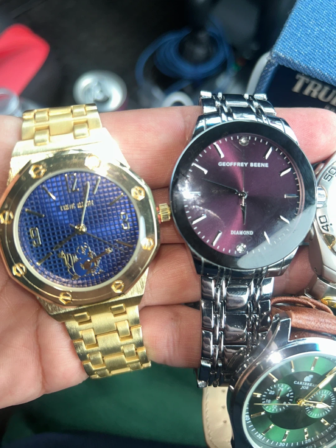 This lot includes four men's watches. One is a gold-tone watch with a blue textured dial. Another is a Geoffrey Beene watch with a purple dial and diamond accent. There's also a silver and gold-tone watch with a textured dial. Finally, a watch with a green dial and brown leather strap is included. These watches offer a variety of styles.