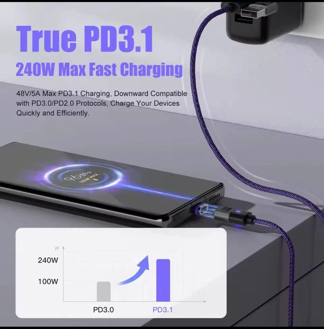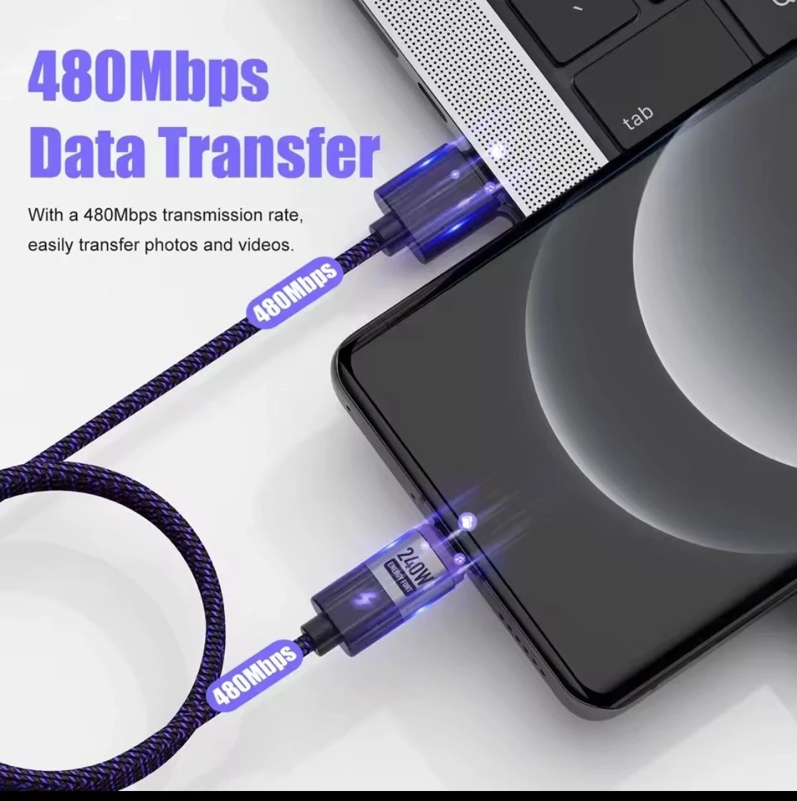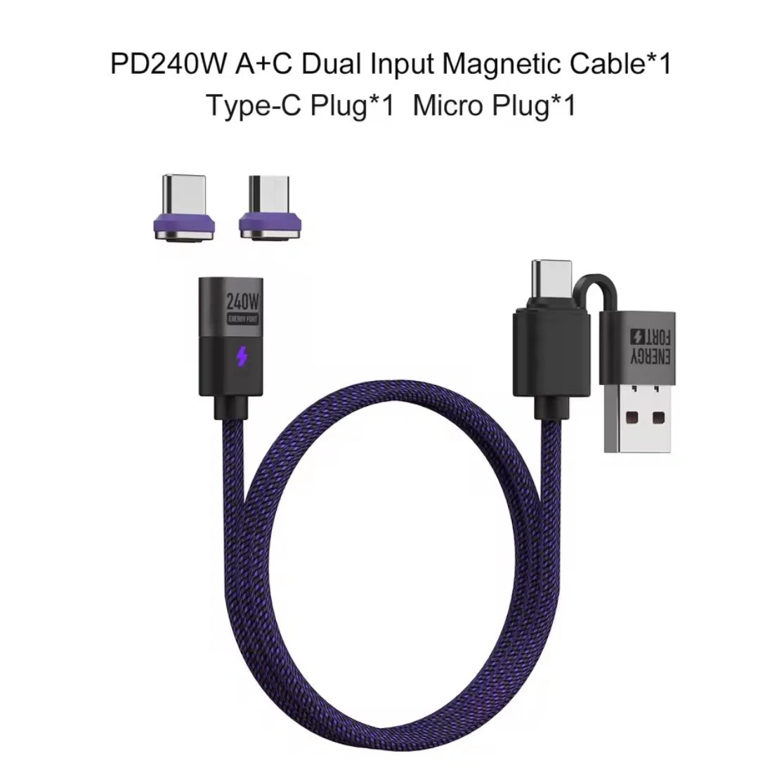 This Energy Fort cable supports True PD3.1 240W max fast charging with 48V/5A. It features a magnetic connection for effortless charging and 480Mbps data transfer. The cable has a 3.5mm ultra-thin nylon braiding for durability.