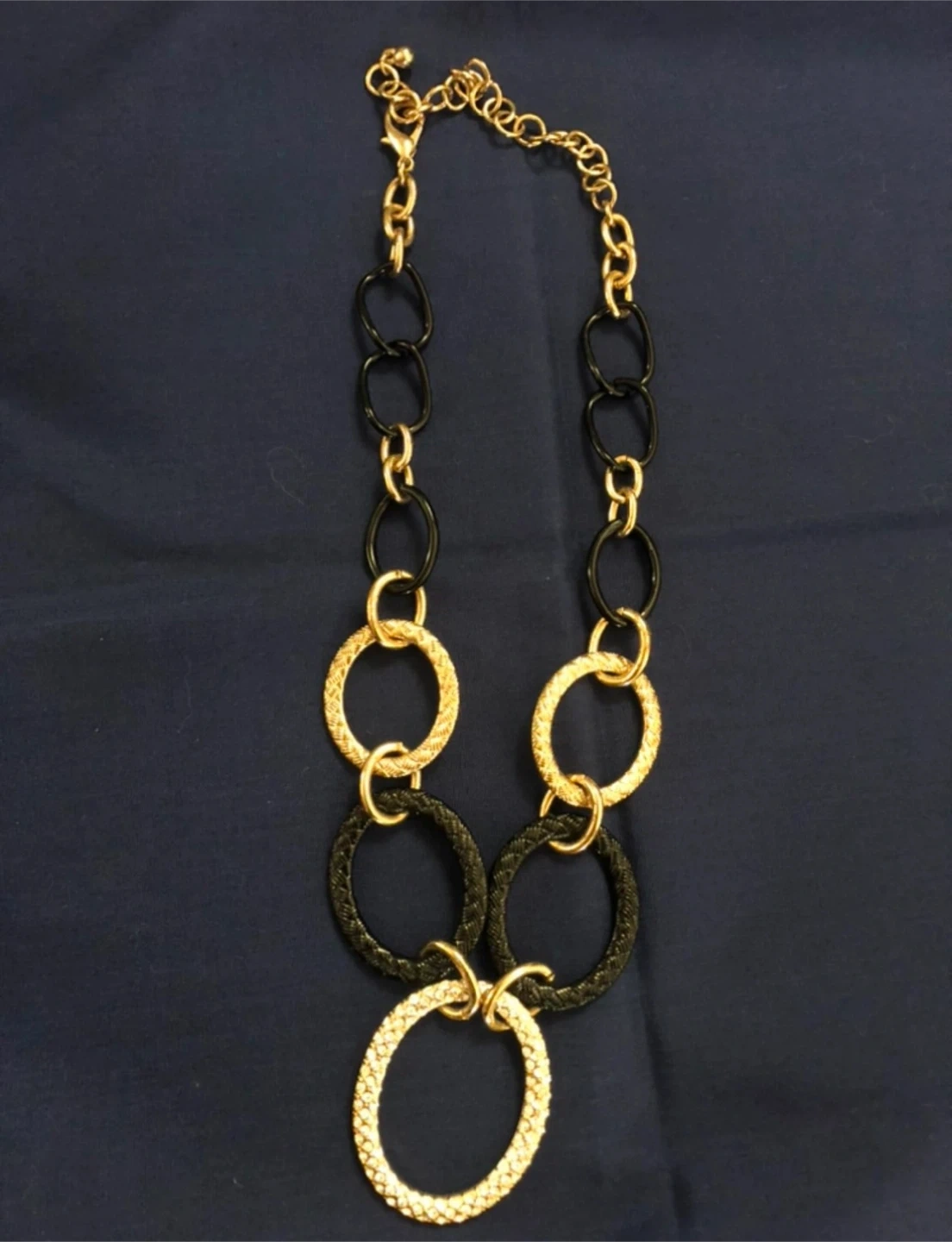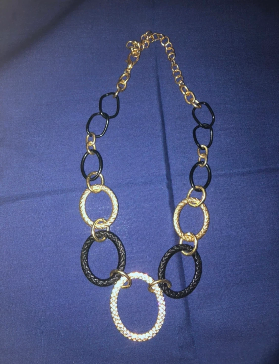 A stylish gold-tone necklace featuring a mix of black and gold textured rings, with a large central oval ring encrusted with rhinestones. It's a statement piece that's sure to add flair to any outfit. The chain is gold-toned with black oval links interspersed.