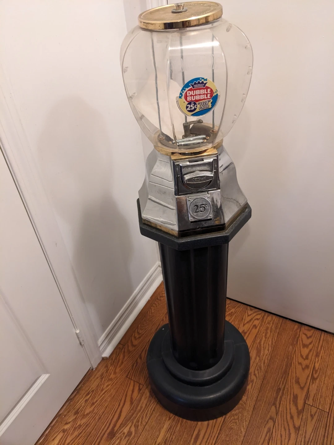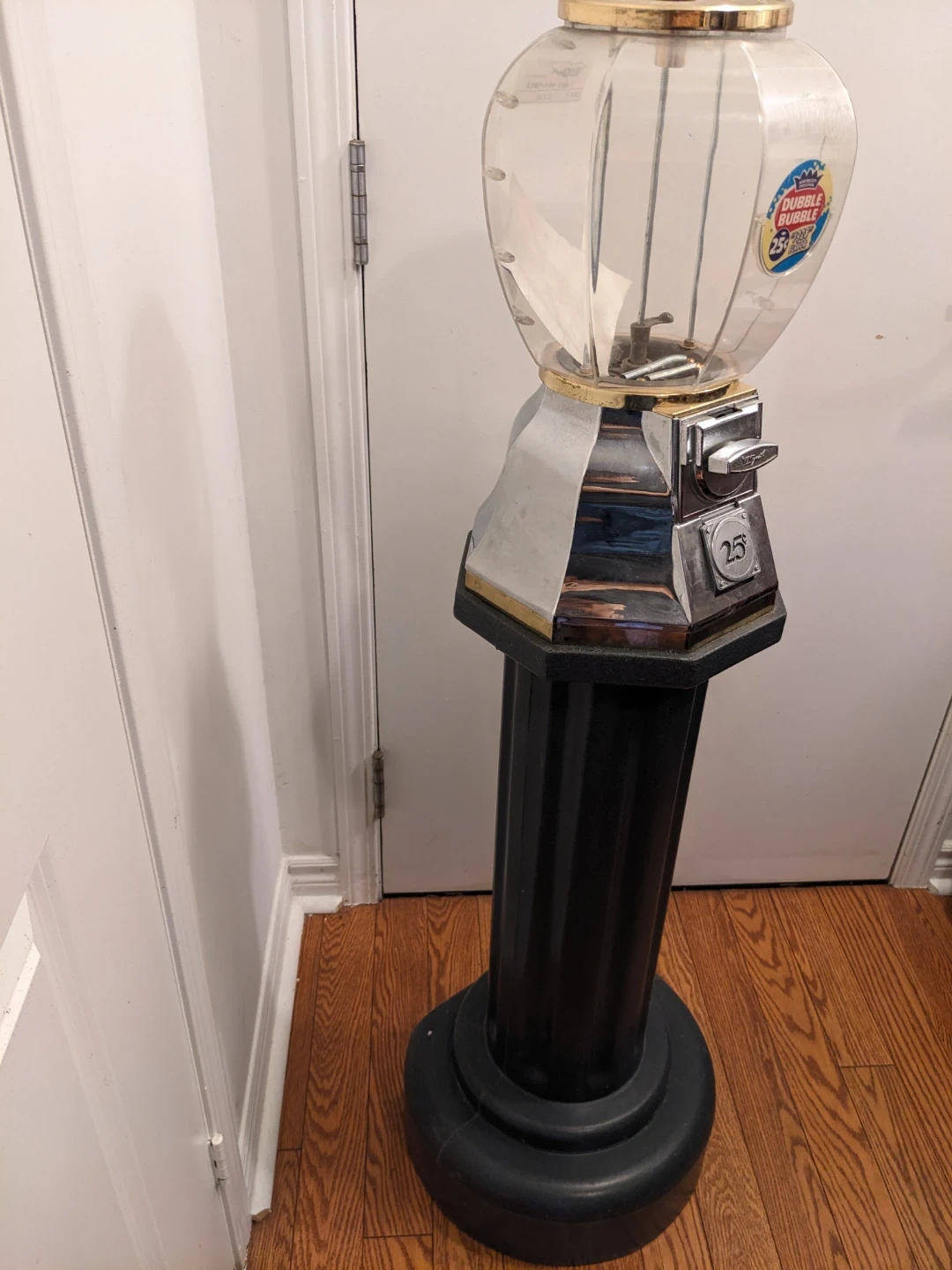 This is a classic Dubble Bubble gumball machine on a black fluted stand. It's designed for 25-cent coin operation. It's a fun piece for a game room or business! No keys available.