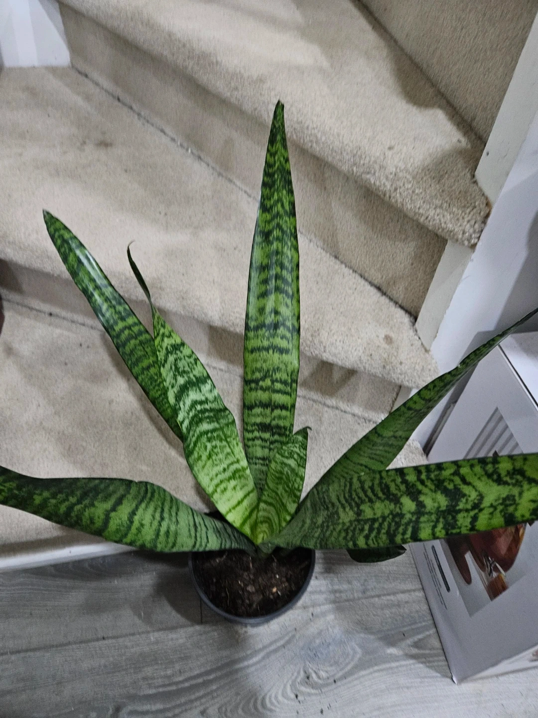 Healthy snake plant in a black pot. Leaves are a vibrant green with dark stripes. This plant requires very little maintenance.