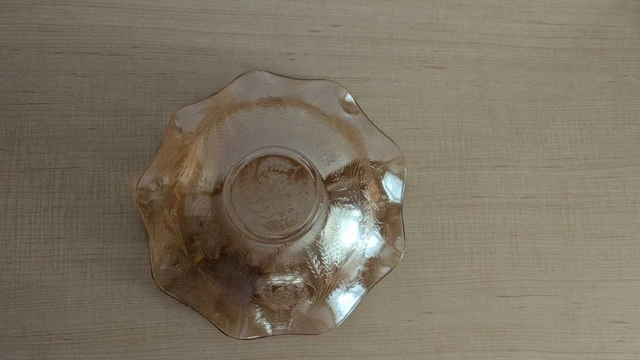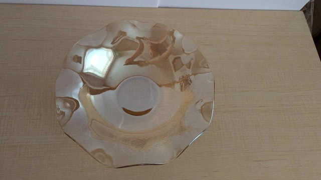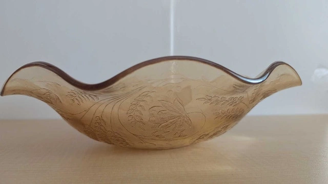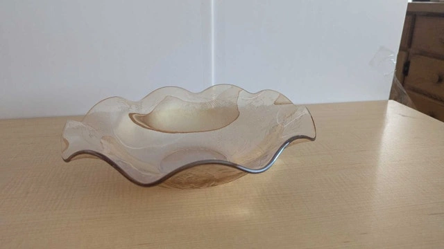 This is a used decorative bowl with a pretty design and warm, golden tones that could add a touch of elegance to any room. It's in good condition, ready to be displayed or used. Who knows what treasures this bowl could hold? Just remember, if you're seeing this ad, the bowl is still available!