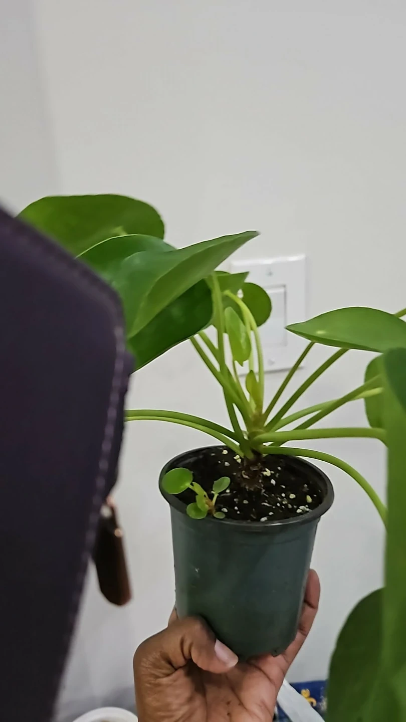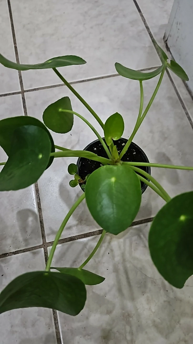A healthy Pilea Peperomioides plant in a small pot. It's a young plant with several leaves and a few small pups starting to grow. This plant is well-suited for indoor environments.