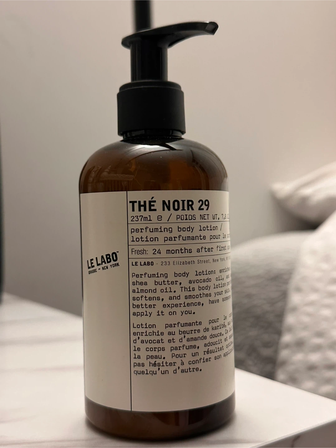 Le Labo Thé Noir 29 perfuming body lotion. 237ml bottle. Contains shea butter, avocado oil, and almond oil. It smooths skin for a better experience.