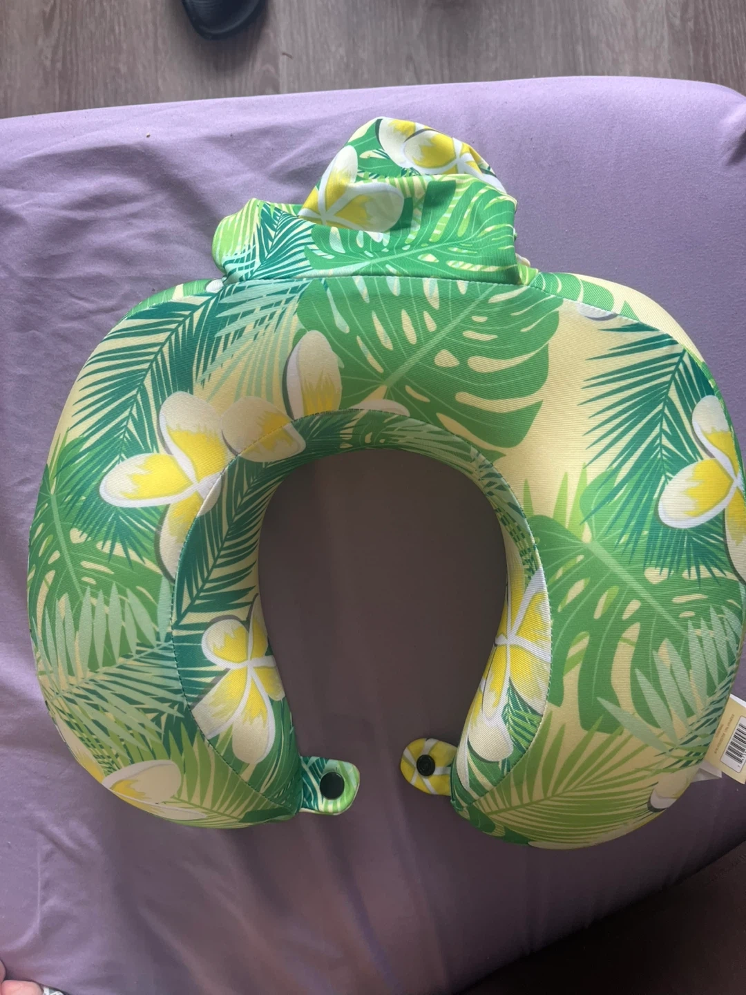 This U-shaped neck pillow features a vibrant tropical leaf and flower print. It's designed for comfort during travel or relaxation. The pillow's cover is made of soft fabric and memory foam.