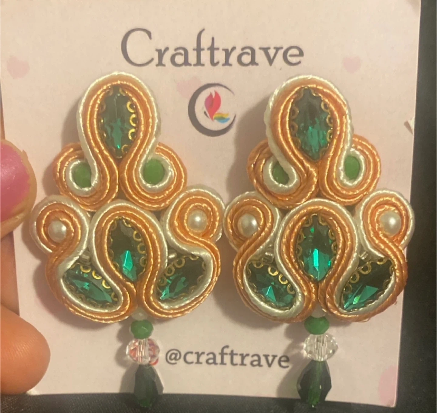 These Craftrave earrings feature a beautiful soutache design with green accents. They're perfect for adding a touch of elegance to any outfit!