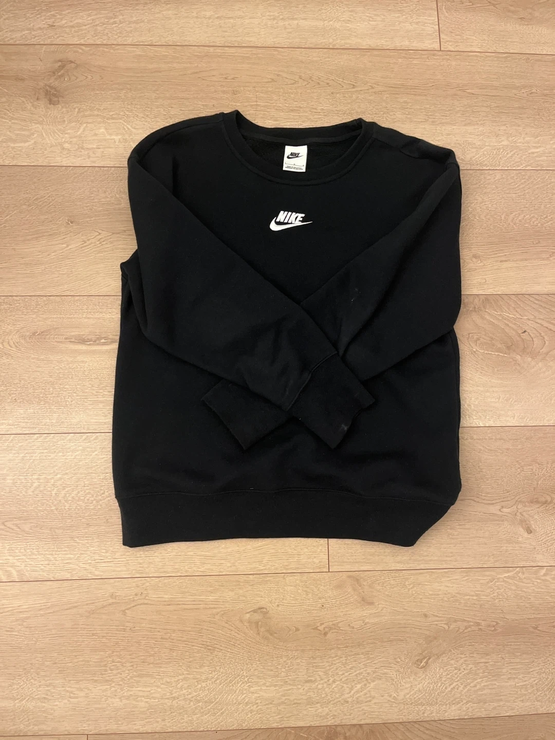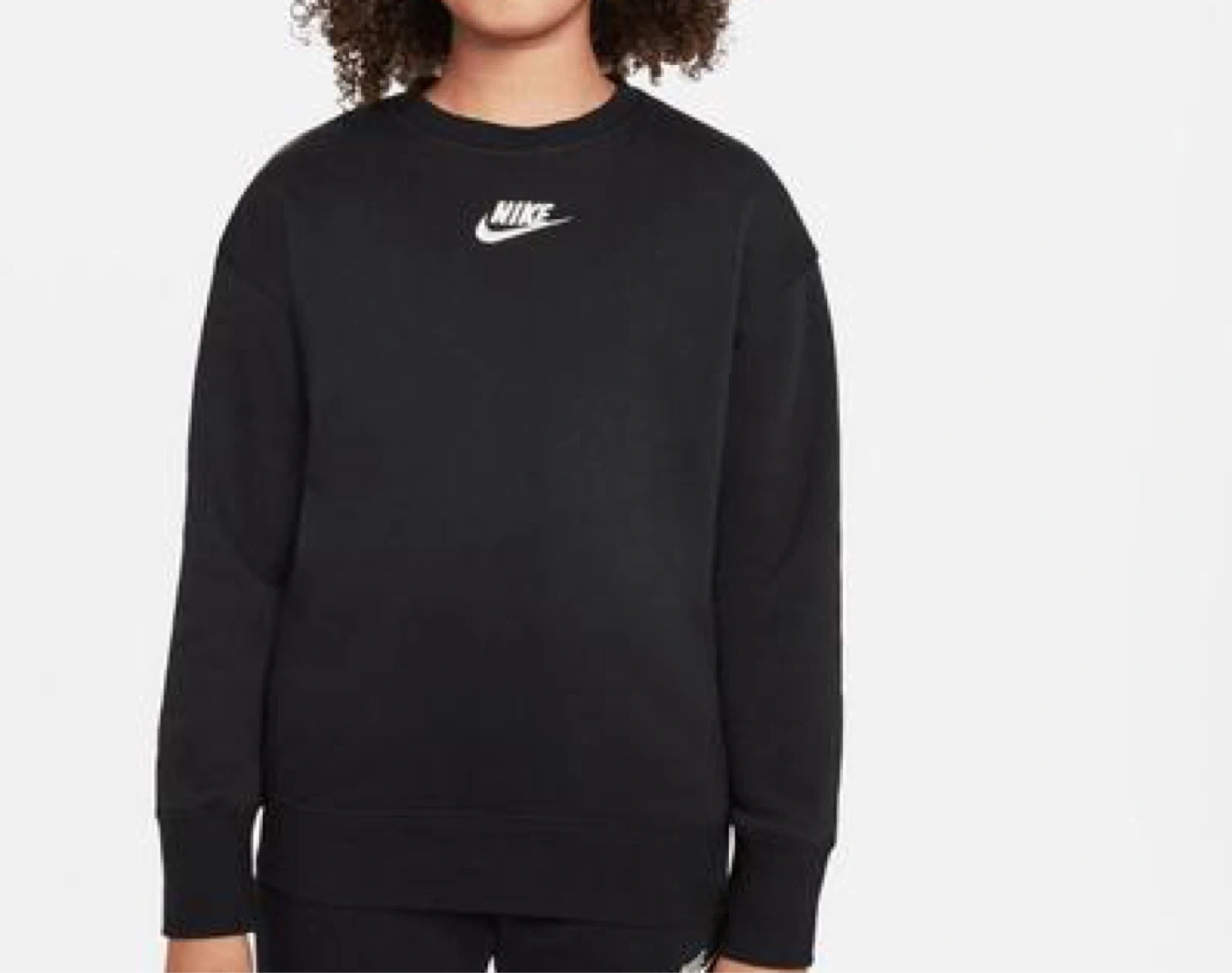 Classic black Nike crewneck sweatshirt. Features the iconic Nike swoosh logo embroidered on the chest. Made from a comfortable blend, it's perfect for everyday wear. Kids, large.