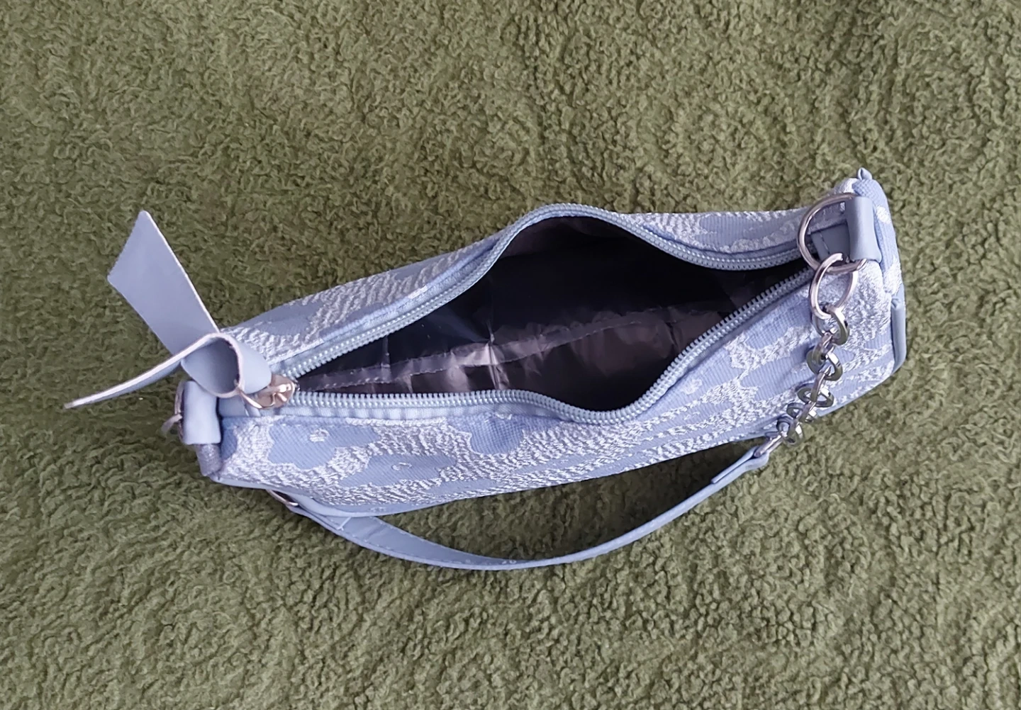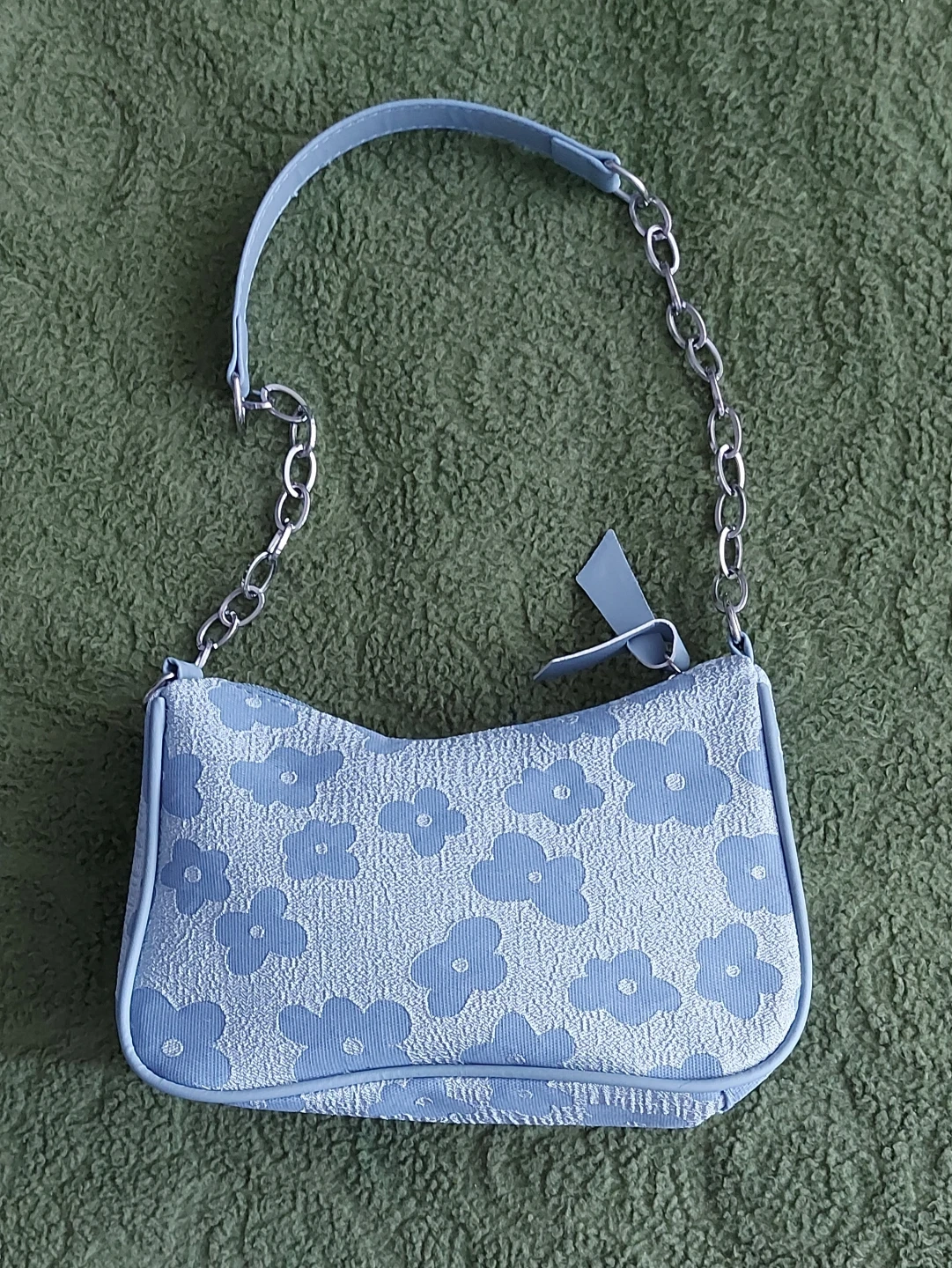 Brand new and never used cute light blue shoulder bag with a floral pattern. Size us small, 22*15cm abd the lenght of the strap is 27cm. It has a silver chain strap and a faux leather shoulder strap. Zipper closure.