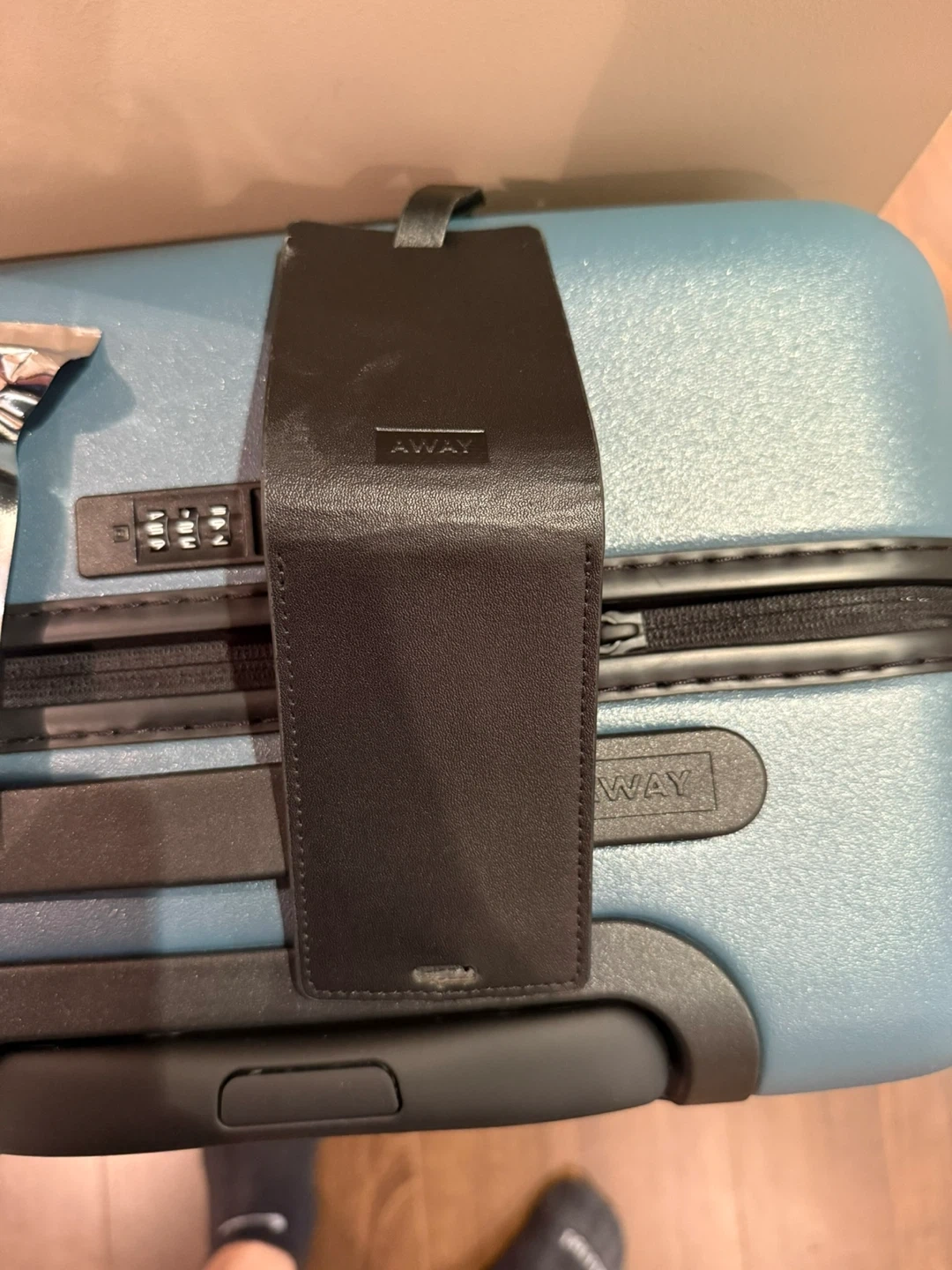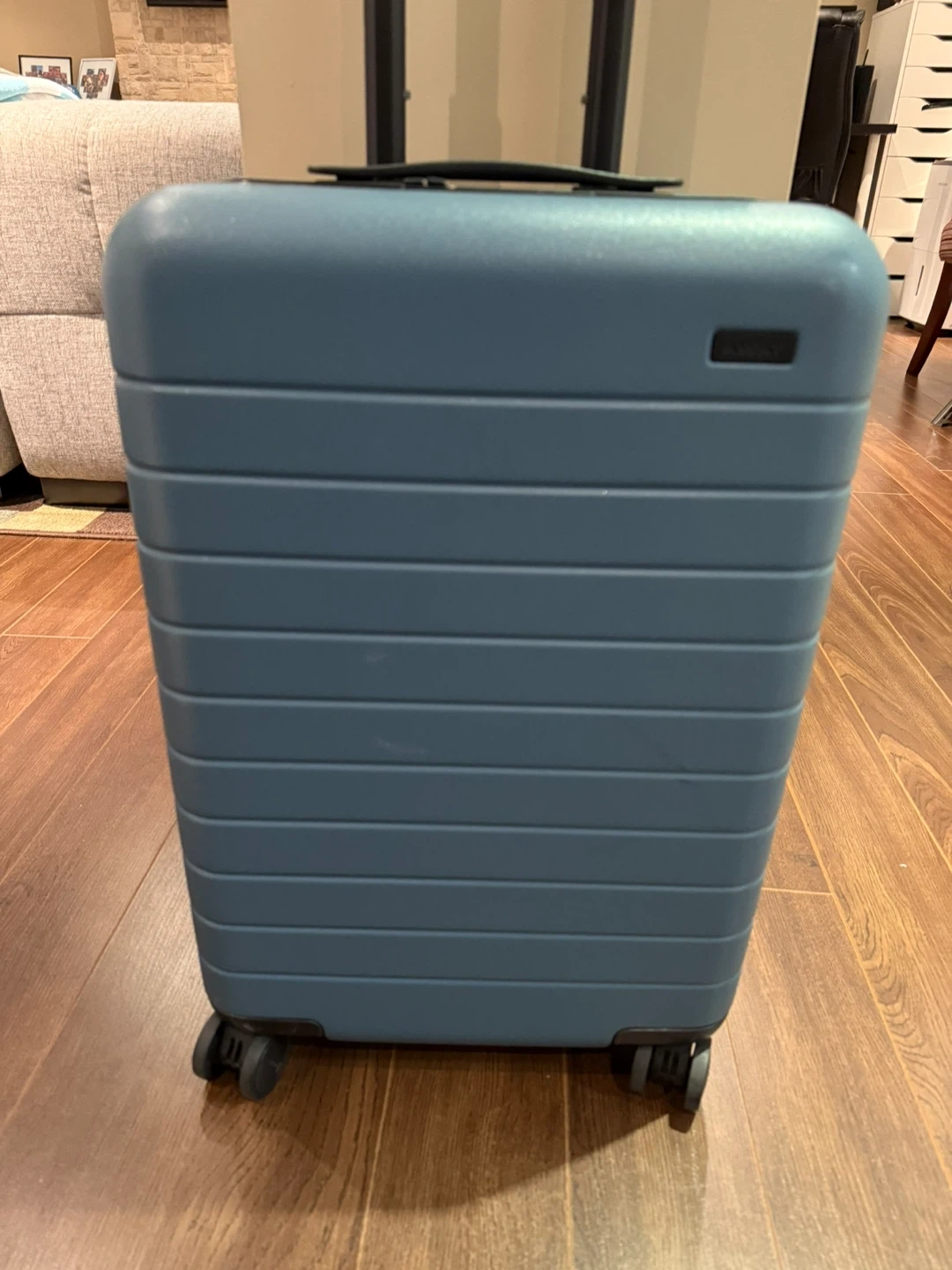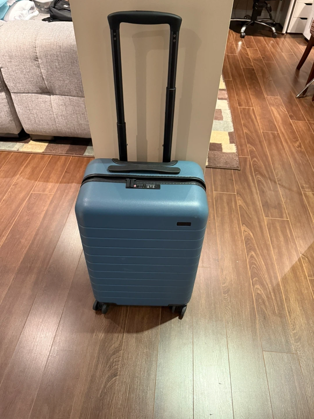 This is an Away carry-on suitcase in a nice blue colour. It features an interior compression system to help pack more. It also has a built-in TSA-approved lock for security. This suitcase is perfect for weekend trips or as a carry-on for longer journeys!