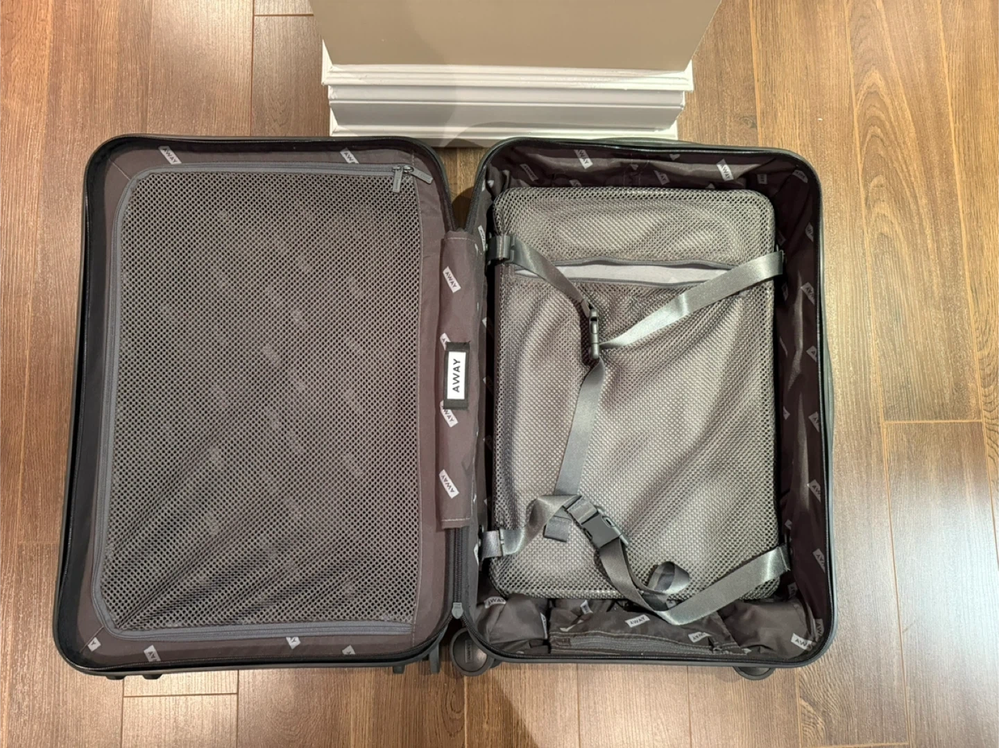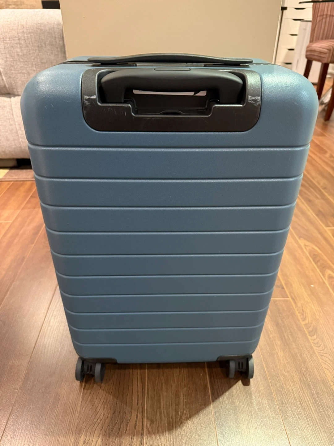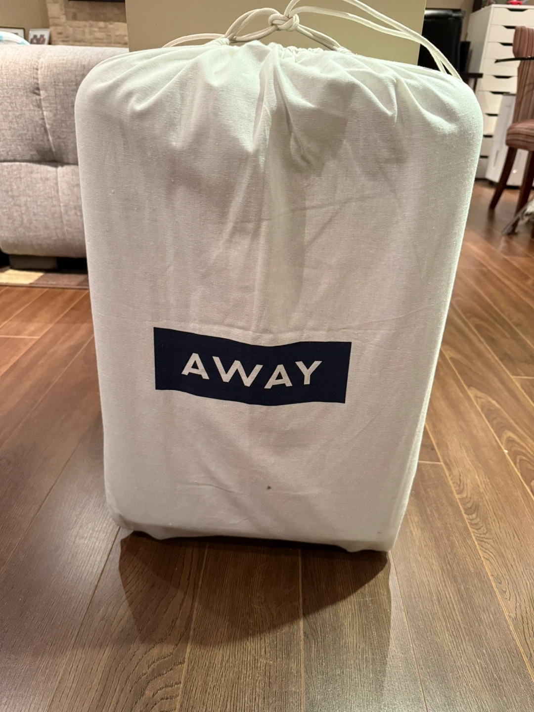 This is an Away carry-on suitcase in a nice blue colour. It features an interior compression system to help pack more. It also has a built-in TSA-approved lock for security. This suitcase is perfect for weekend trips or as a carry-on for longer journeys!
