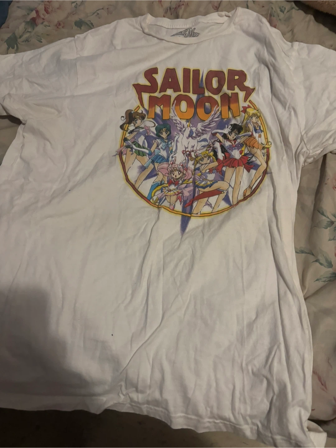 White Sailor Moon graphic t-shirt. It's made of cotton material. This tee is great for fans of the anime series! Adult size x-large