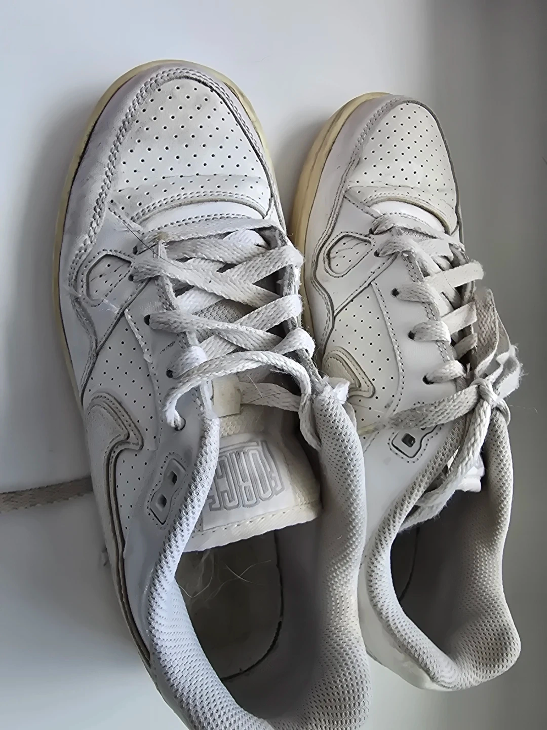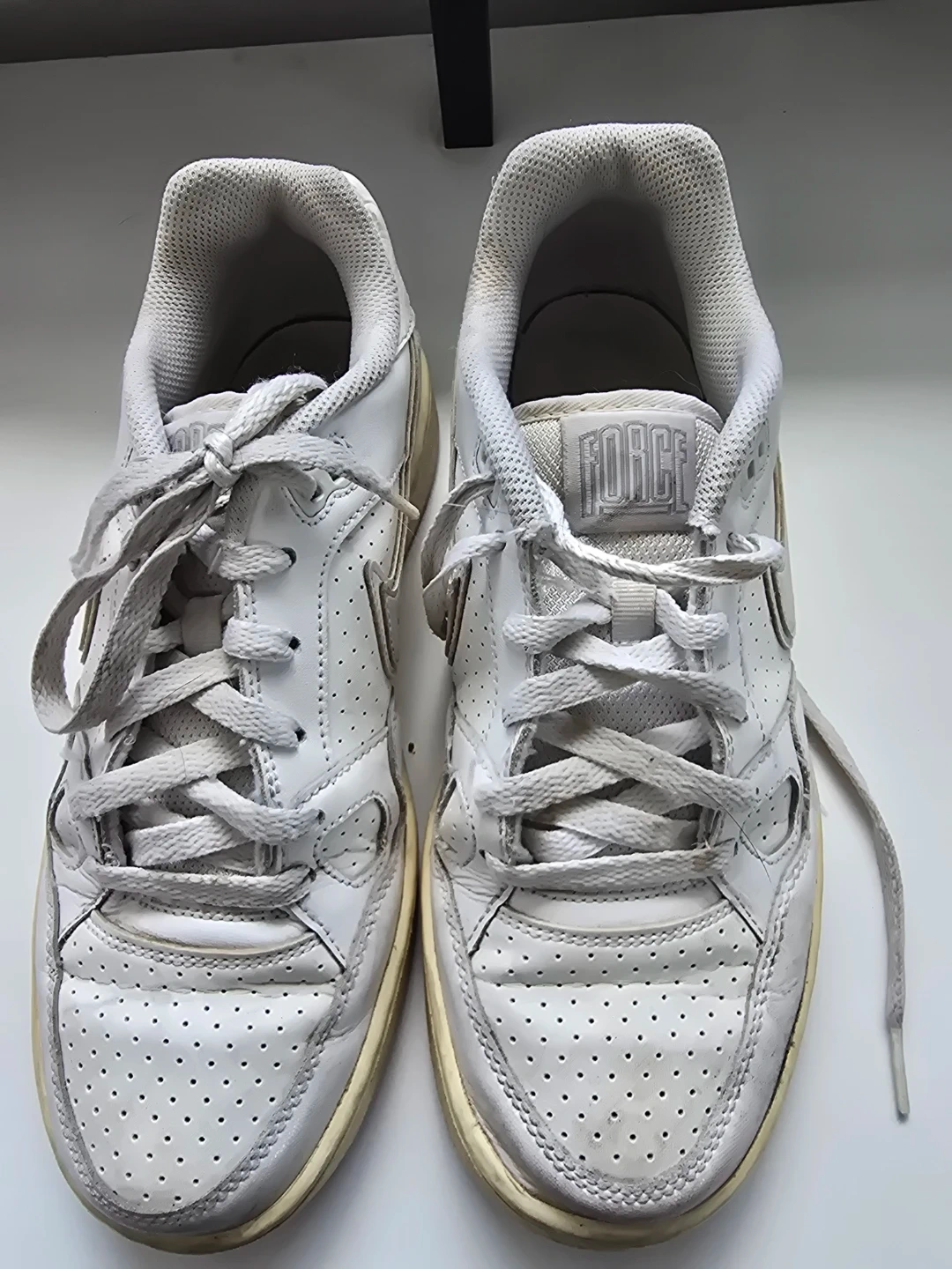 White leather Nike Air Force 1 sneakers. Features a classic low-top design with perforated detailing. These are a well-worn pair, showing signs of use but still with plenty of life left. Perfect for everyday wear.