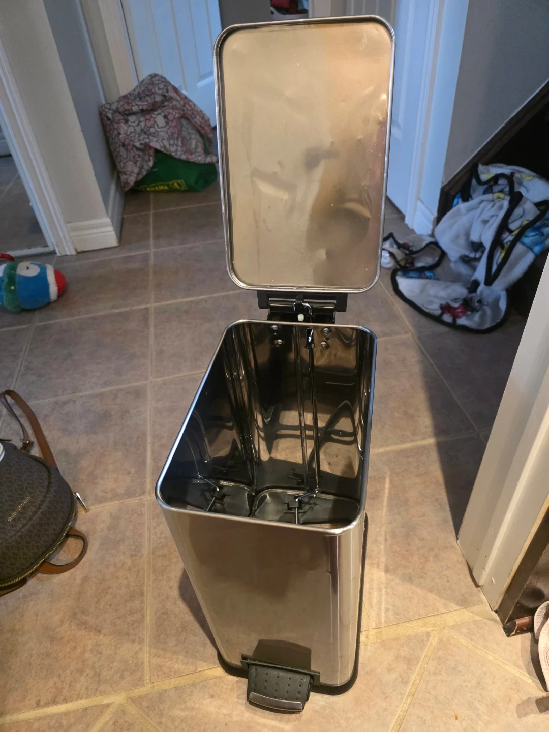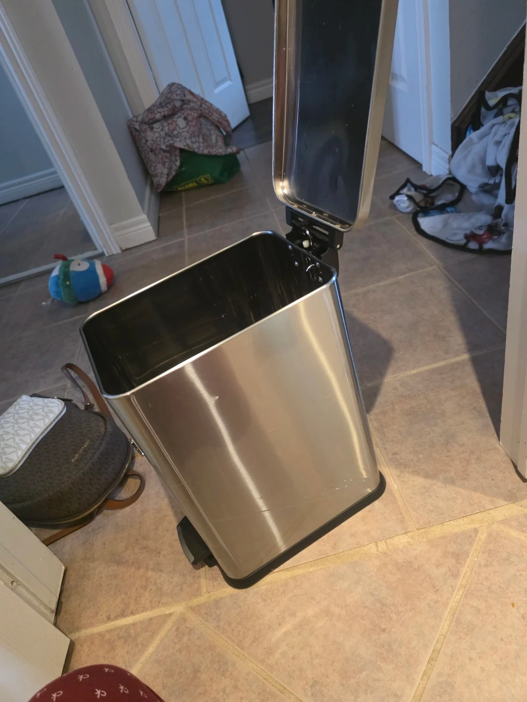 Rectangular stainless steel trash bin with a foot pedal for hands-free operation. It's a 10-gallon capacity can. Ideal for a kitchen or office space.Stainless Steel Step Can Trash Bin