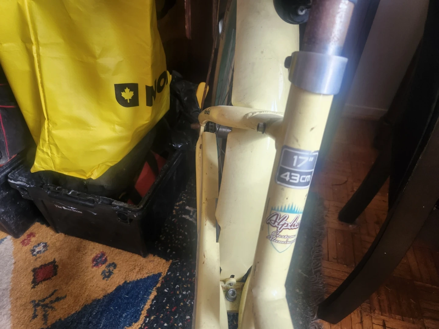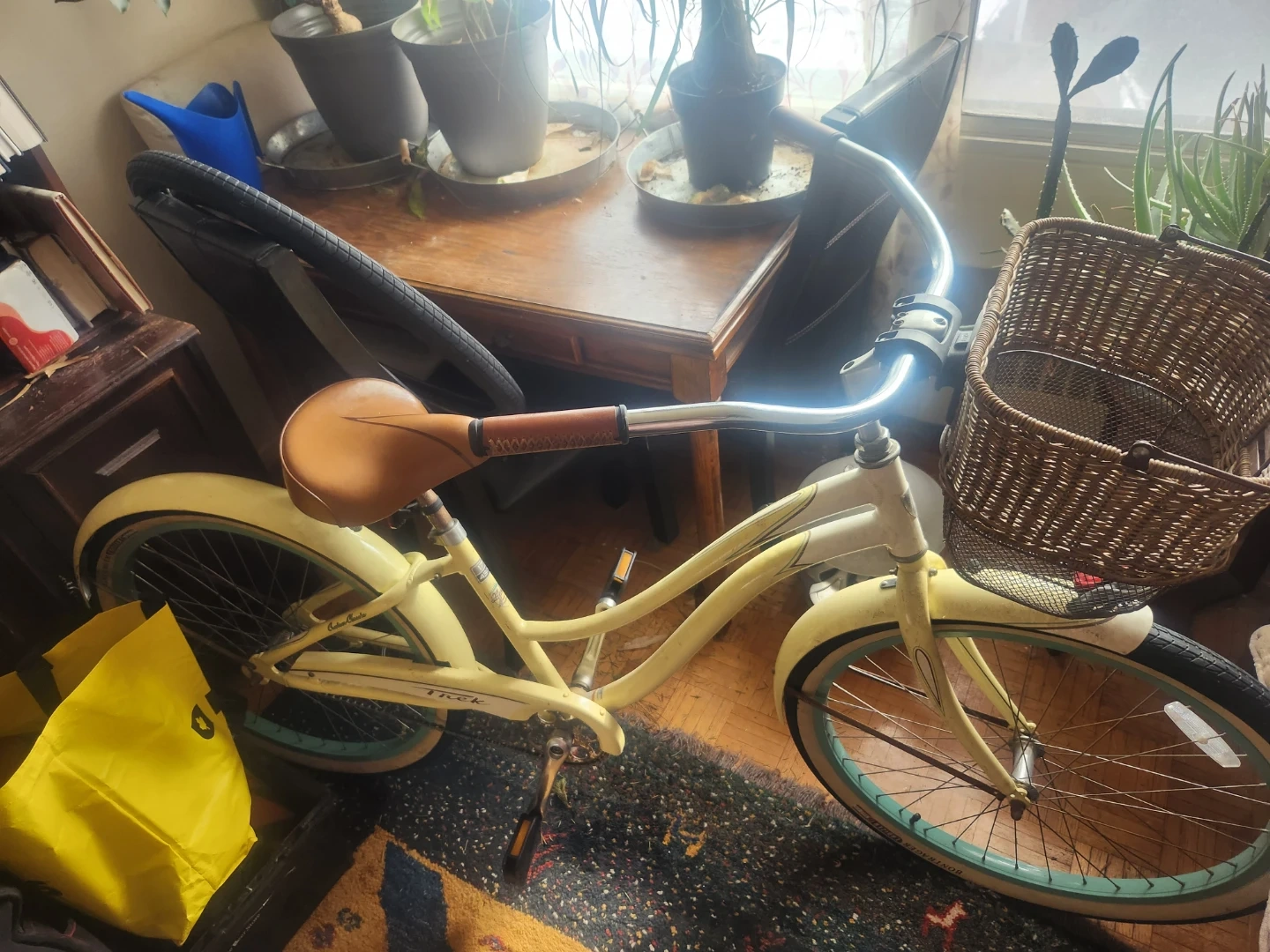A yellow Trek Cruiser Classic bicycle. It's a 17" (43 cm) frame size with Alpha Aluminum construction. It includes a front basket and a comfortable saddle. White wall tires a real head turner
