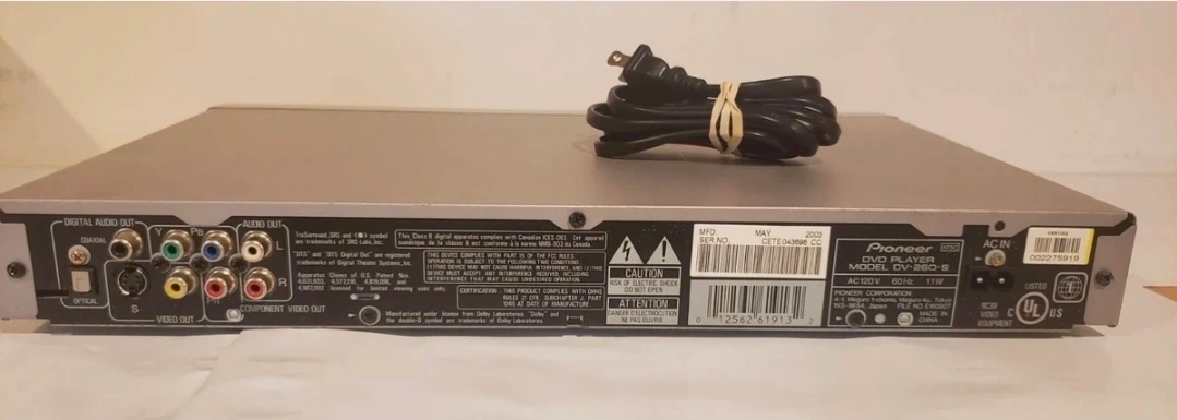 I'm selling a used Pioneer DVD Player, model number DV-260. It's a sleek, silver unit that has been thoroughly tested and is in working condition. Please note that the remote is not included.