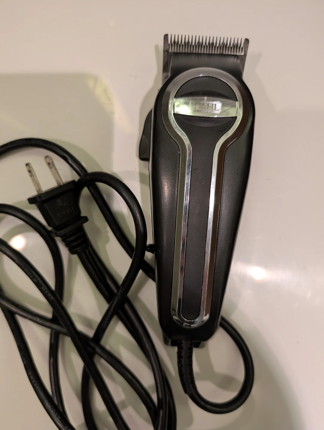 This is a Wahl corded hair clipper. It's black with a chrome accent. The cord is quite long. It's suitable for home haircuts.