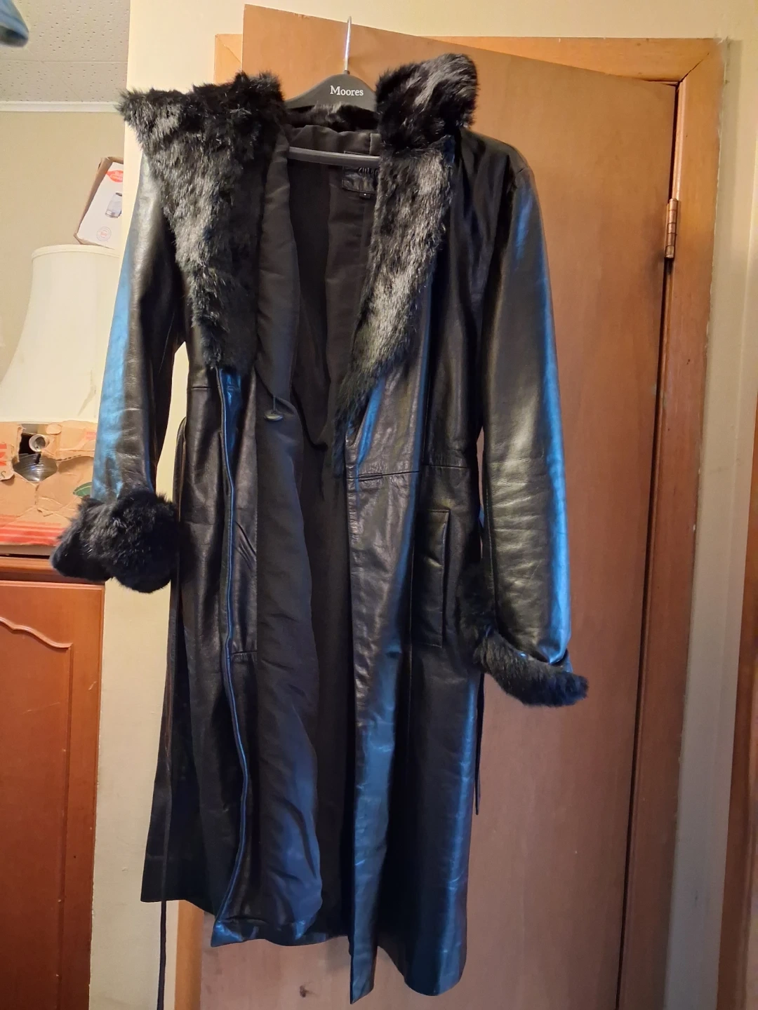 This is a stylish black leather trench coat with rabbit fur trim on the collar and cuffs. It features a longline silhouette and a tie belt for cinching. The interior lining is smooth satin. Perfect for cooler weather!