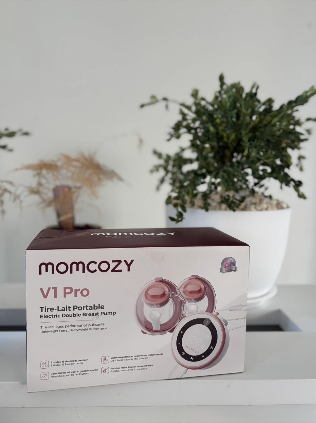 Momcozy V1 Pro portable double breast pump. Wearable, hands-free design with 2 modes and 15 precision levels. Hospital-grade suction performance. It's lightweight and rechargeable for on-the-go use.