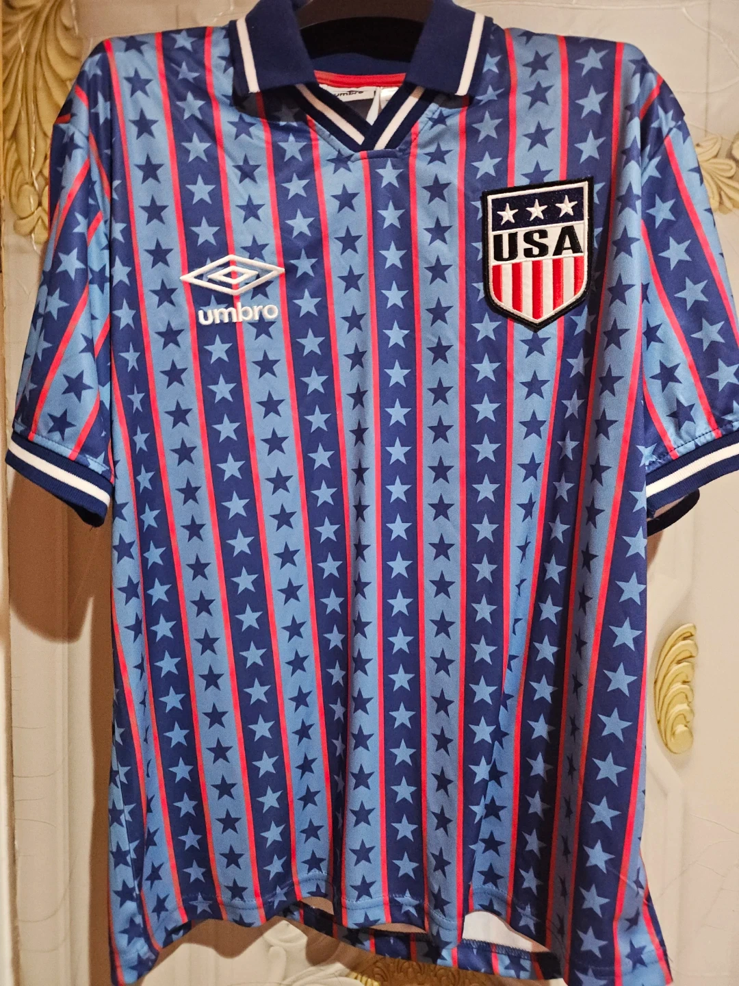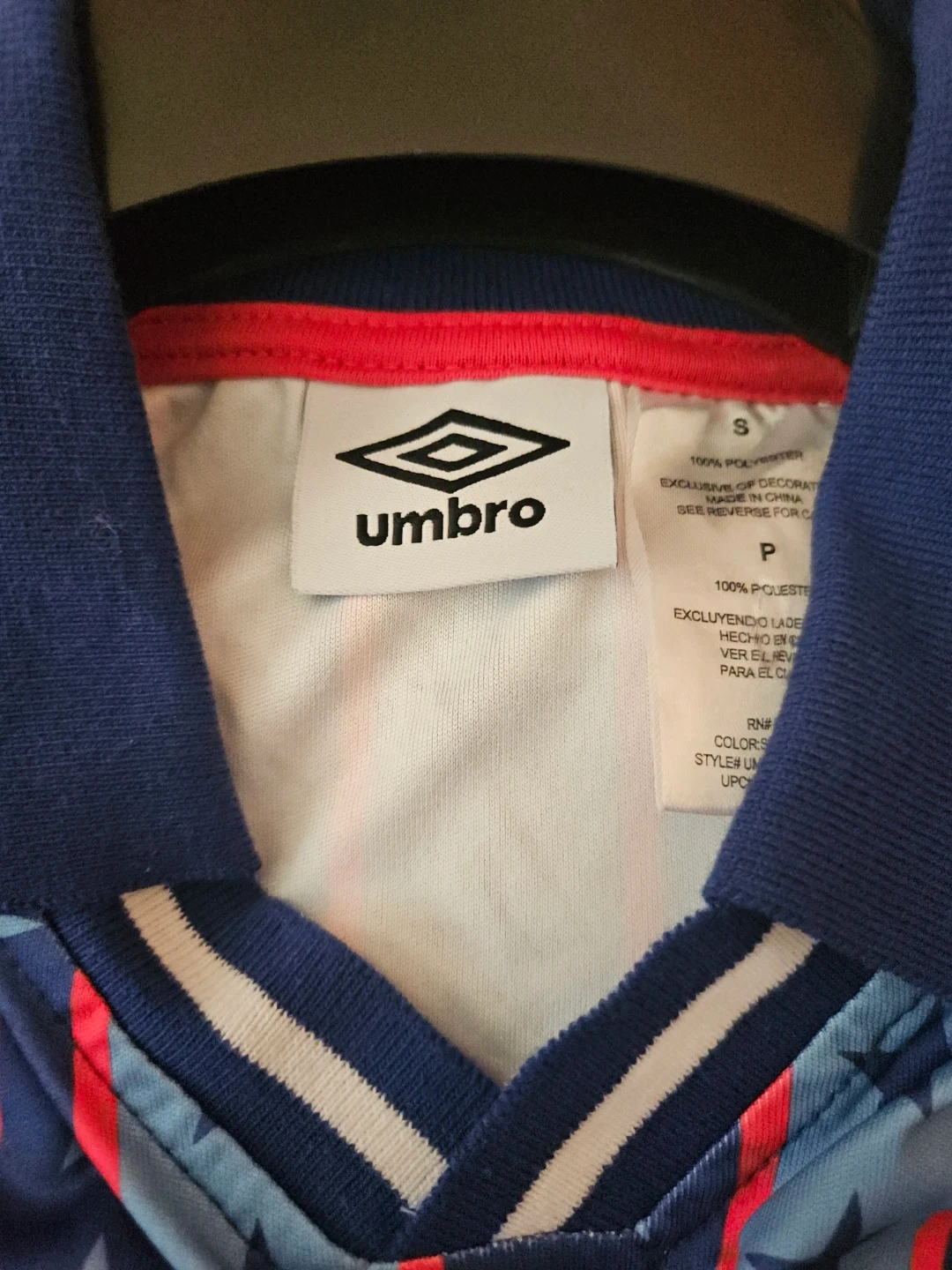 This Umbro soccer jersey features a bold stars and stripes design. It's made of 100% polyester. Size is S.