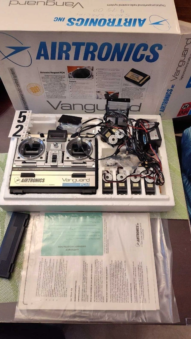 Selling a complete, used Airtronics Vanguard PCM digital proportional radio control system, perfect for RC enthusiasts. This vintage set includes the transmitter, receiver, and several servos, all housed in the original box. The system is in good condition, showing signs of use, and comes with original documentation. Brand: Airtronics, Model: Vanguard PCM, Type: Digital Proportional Radio Control System, Components: Transmitter, Receiver, Servos, Era: 1990s. Asking $150 CAD. If the ad is up, it's still available.