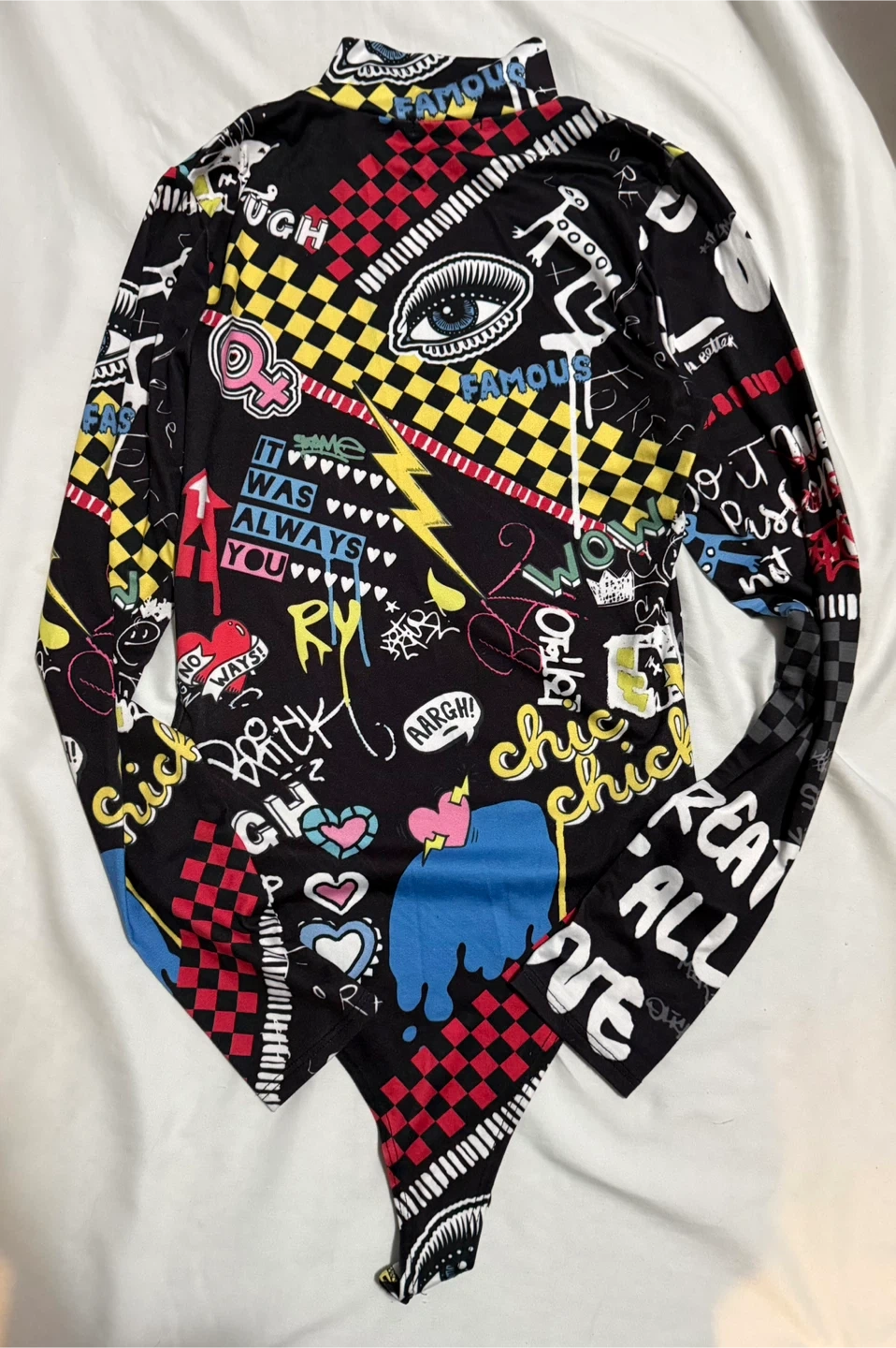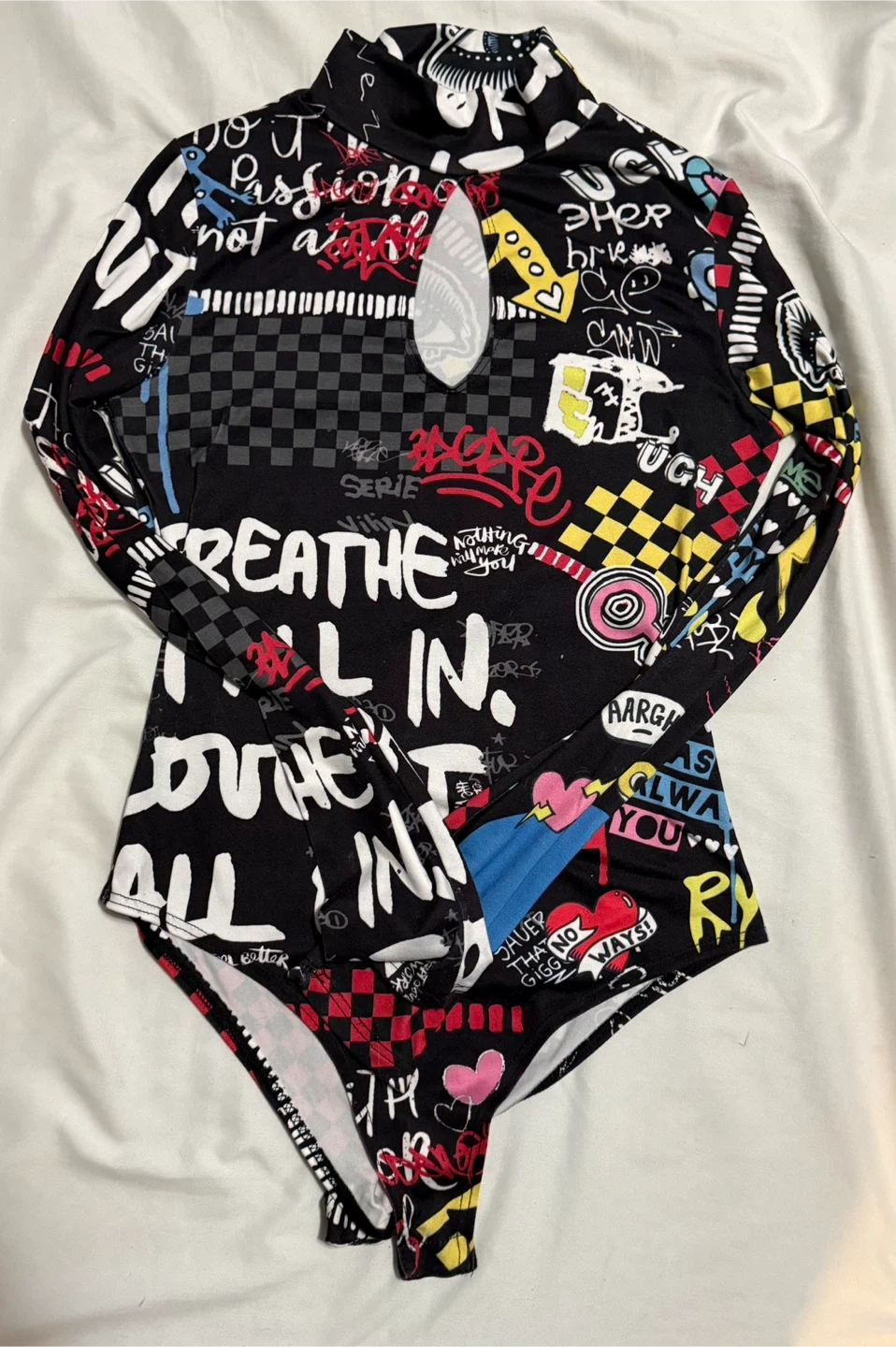 This long sleeve bodysuit features a bold, all-over graphic print with a mix of text and abstract designs. It has a mock neckline and a keyhole cutout at the front. The fabric is stretchy for a comfortable fit. It's a statement piece that's sure to turn heads!