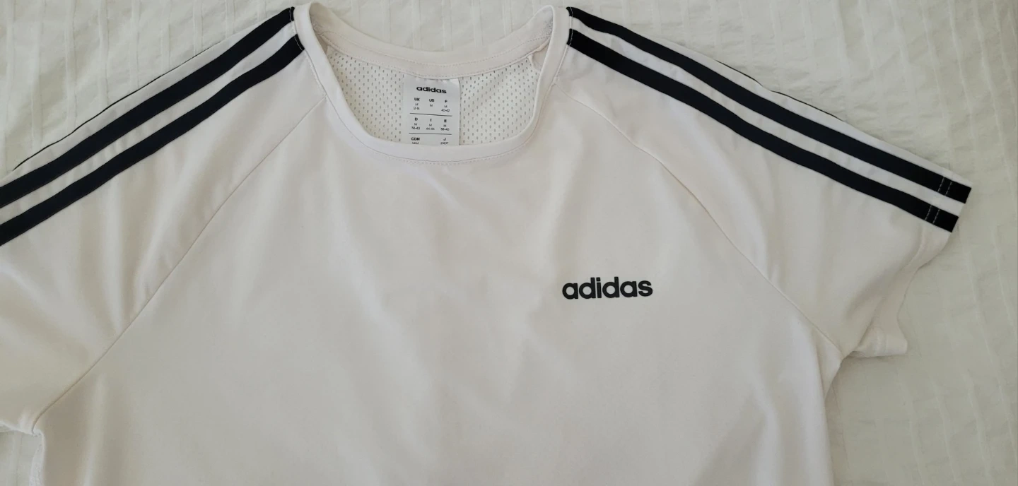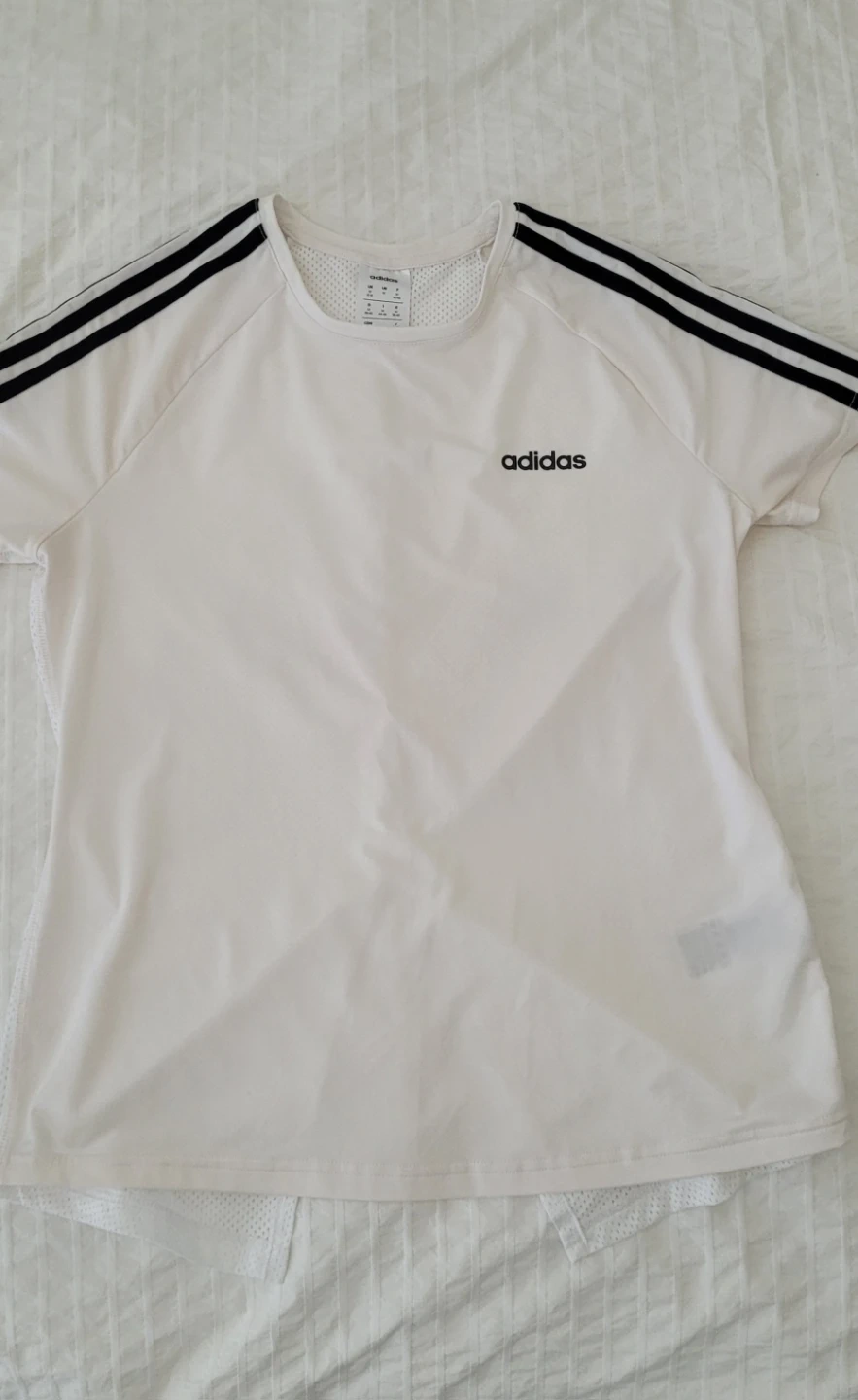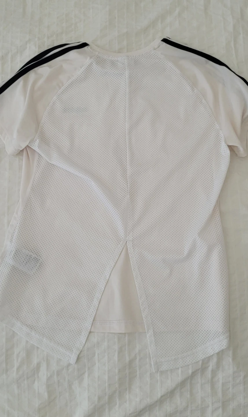 White Adidas t-shirt with signature three stripes on the shoulders. Mesh back panel for ventilation. Size M.