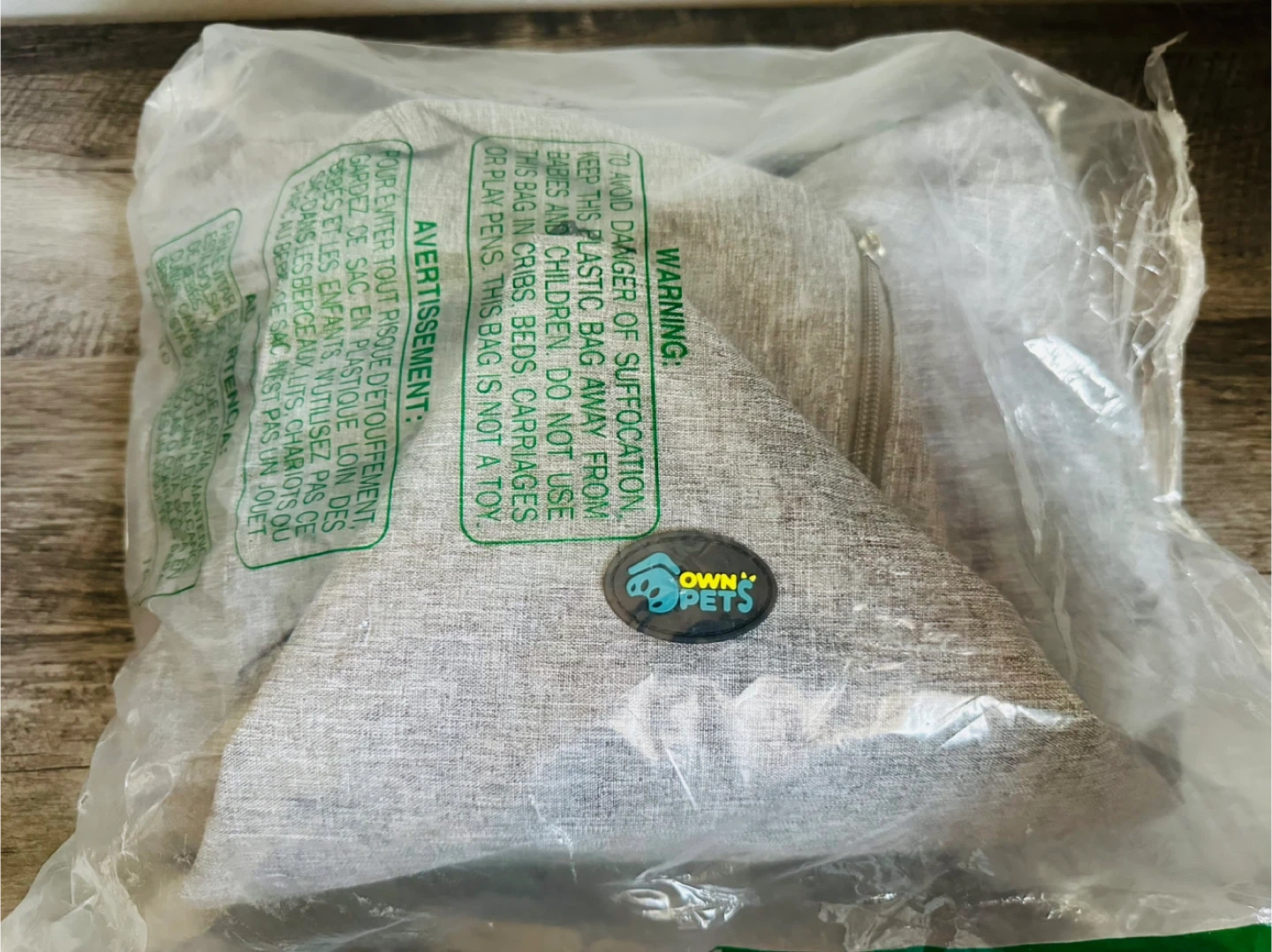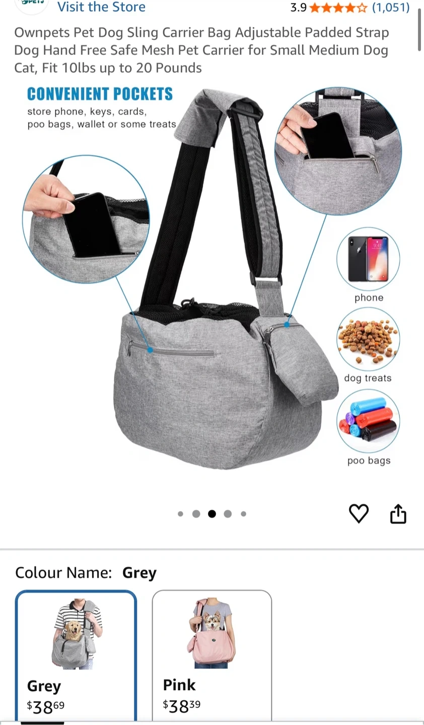 This is a grey pet sling carrier bag. It's made with padded straps for comfort. Features convenient pockets for your phone, keys, or treats. It's suitable for small to medium dogs.
