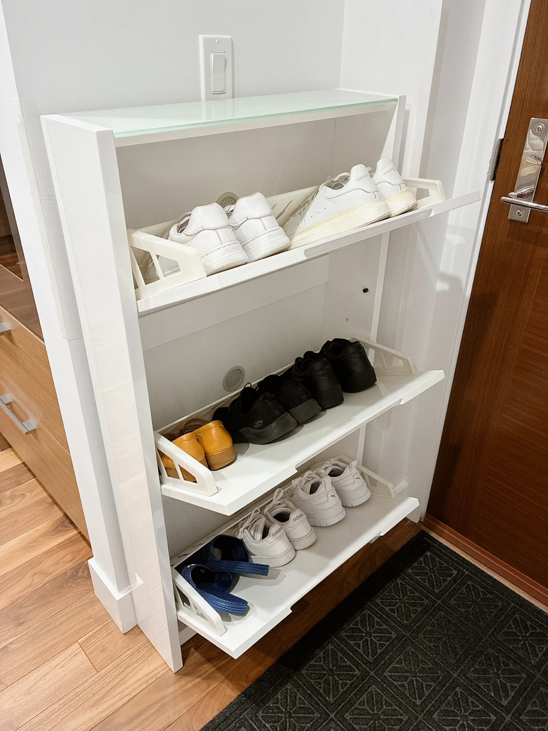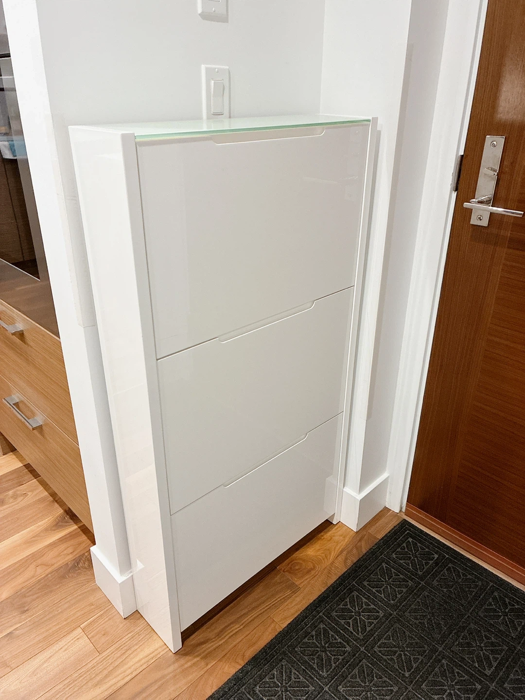 This sleek white shoe cabinet has three flip-out drawers to store your footwear. It's finished with a modern glass top. It's great for keeping hallways tidy!