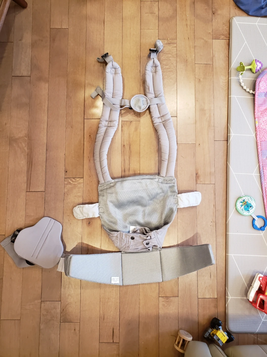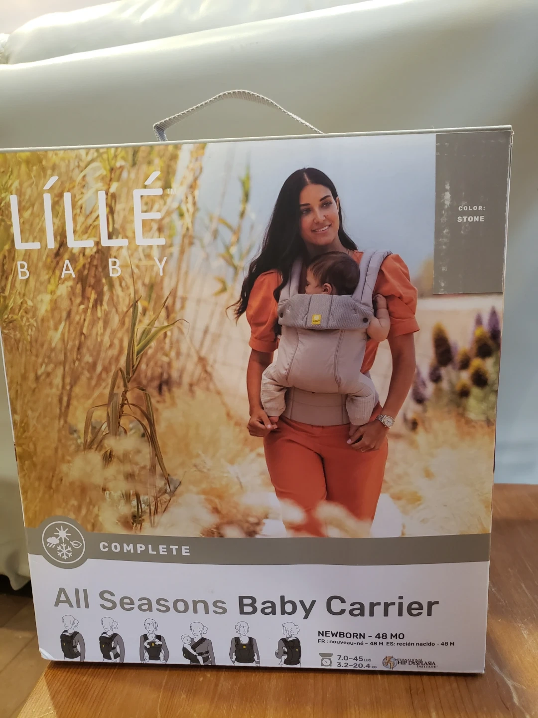 LILLEbaby All Seasons baby carrier in its original box with instruction manual. Features an adjustable head support for baby, a temperature control mesh panel, a sleeping hood, and wide padded waist belt and lumbar support for wearer. Good for newborns to toddlers. Machine-washable, hang-dry.