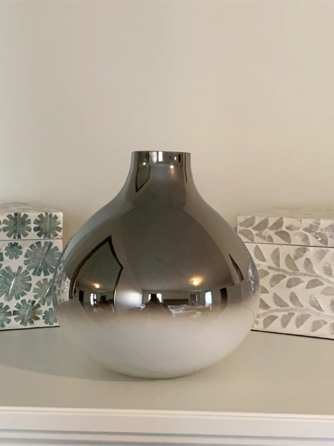 This stylish glass vase set features a beautiful ombre gradient finish, fading from a metallic silver to a clean white. The sleek, modern design makes this set a beautiful accent for any room.