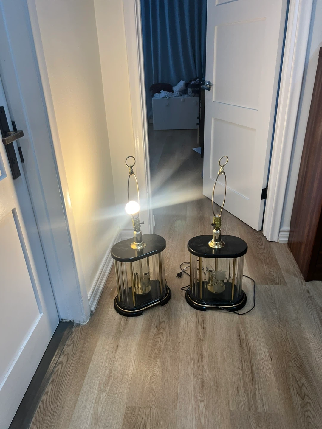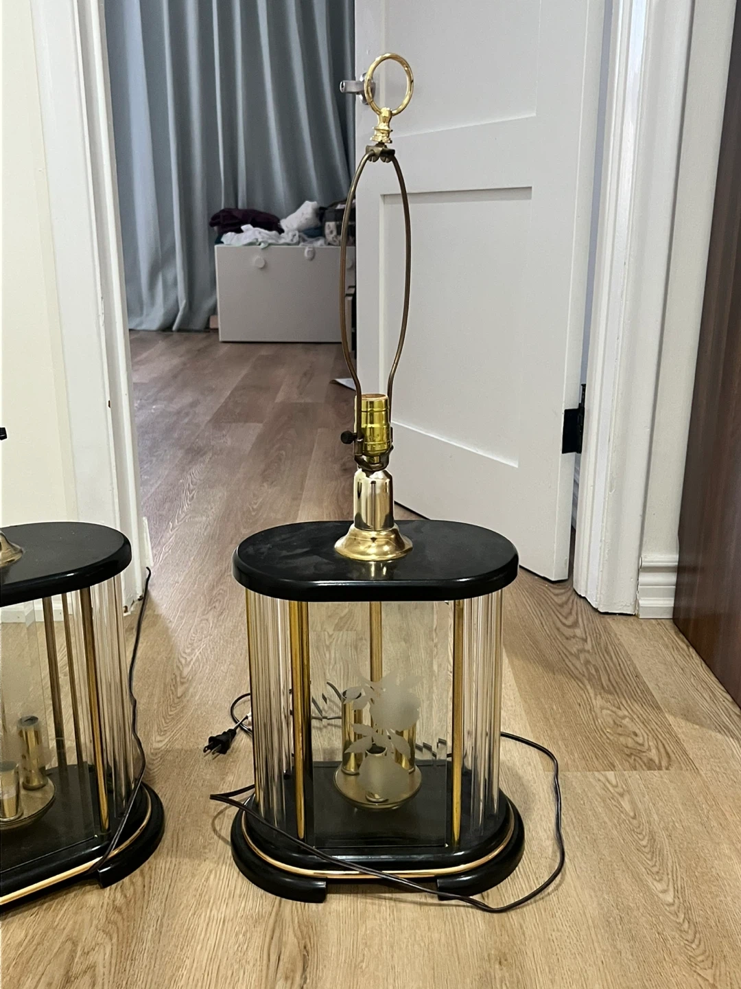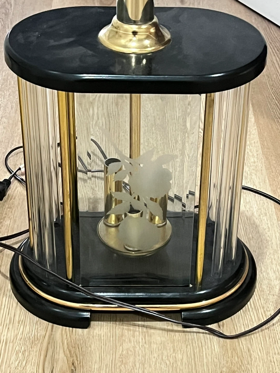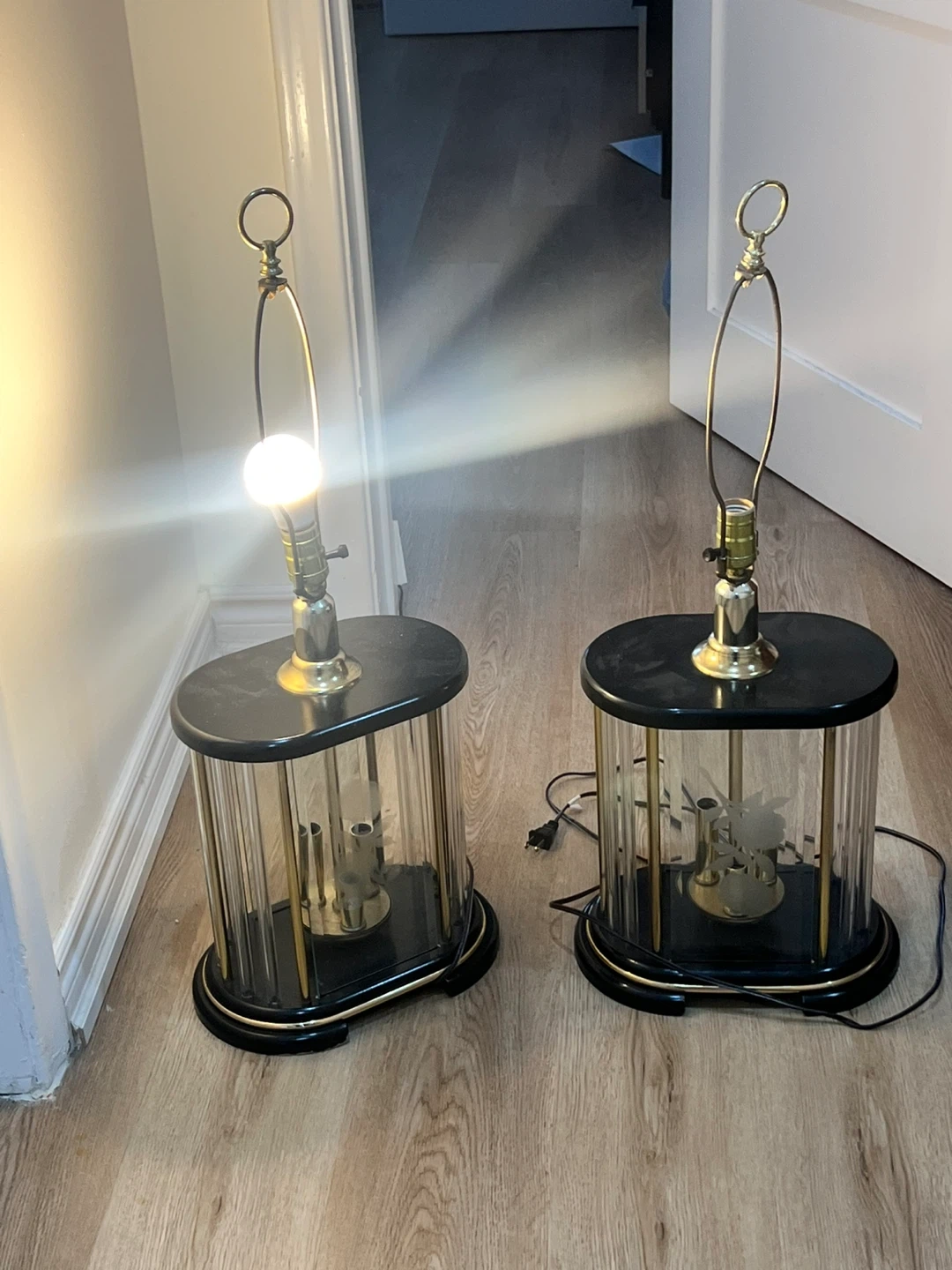 This is a pair of vintage table lamps featuring a black oval base and top with clear ribbed glass cylinders. The lamps have brass accents and a decorative etched floral design inside the glass. They're ideal for adding a touch of retro style to any room.