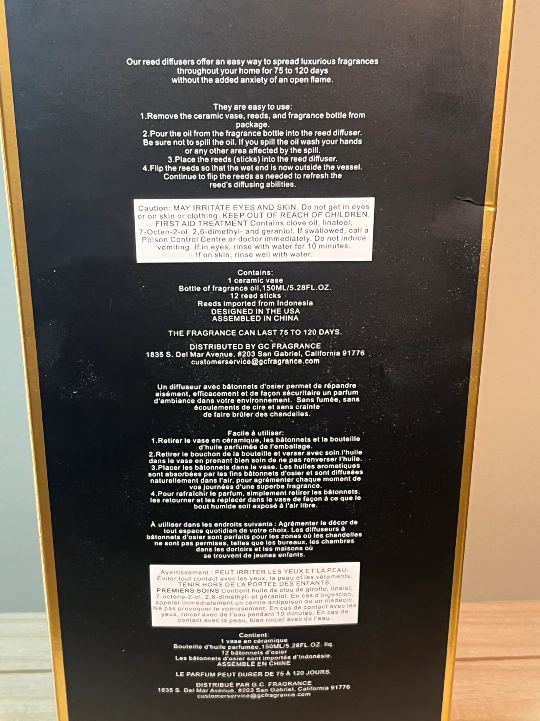 MG Magnolia Blossom reed diffuser offers a high fragrance experience for 75 to 120 days. It includes a ceramic vase, reeds, and a 5.28oz bottle of fragrance oil.