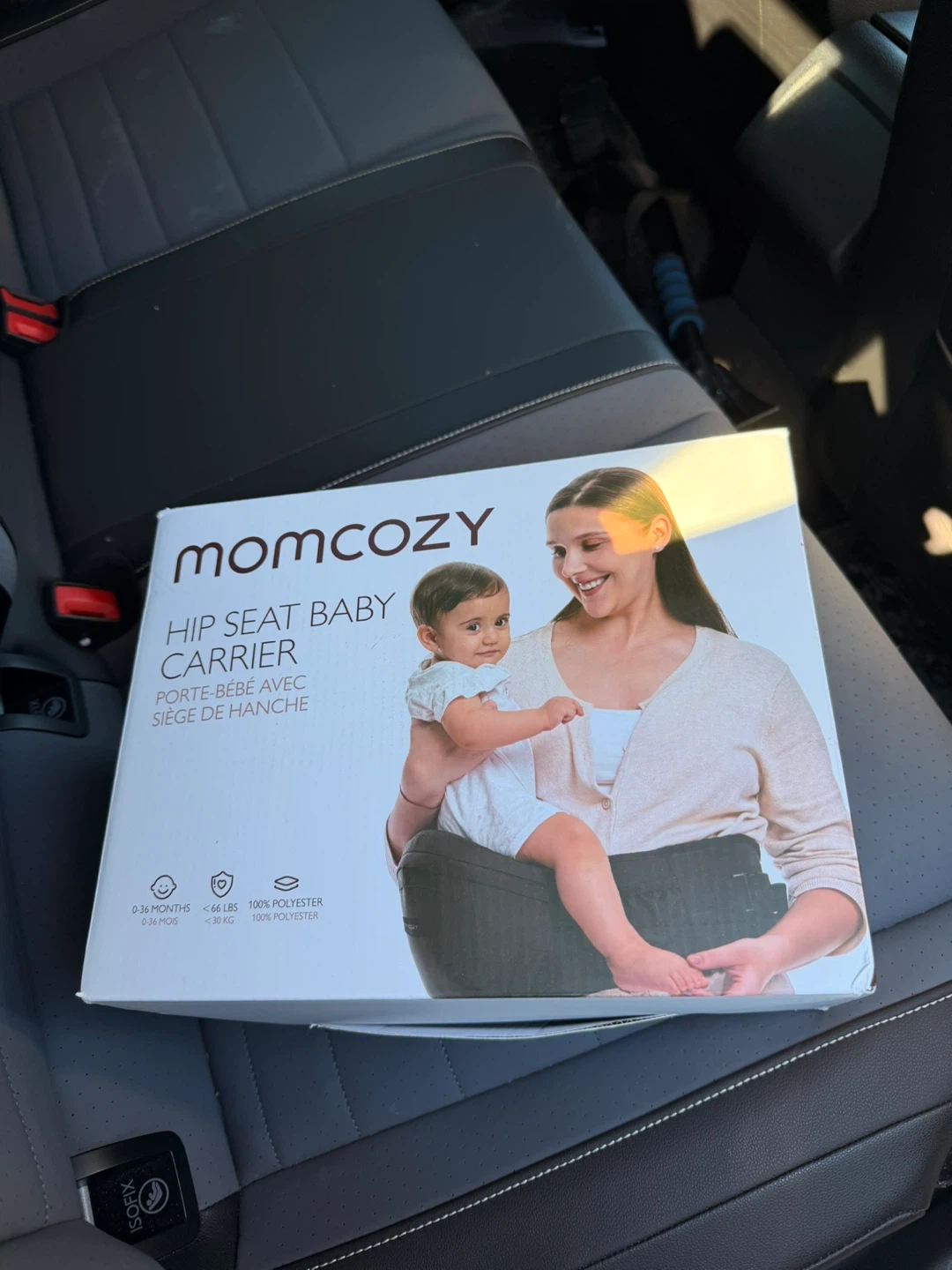 This Momcozy hip seat baby carrier is suitable for 0-36 months and up to 66 lbs. It's made with 100% polyester material. This carrier is great for easily transporting your little one while keeping your hands free.