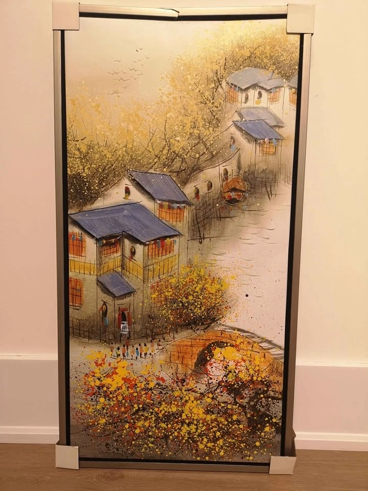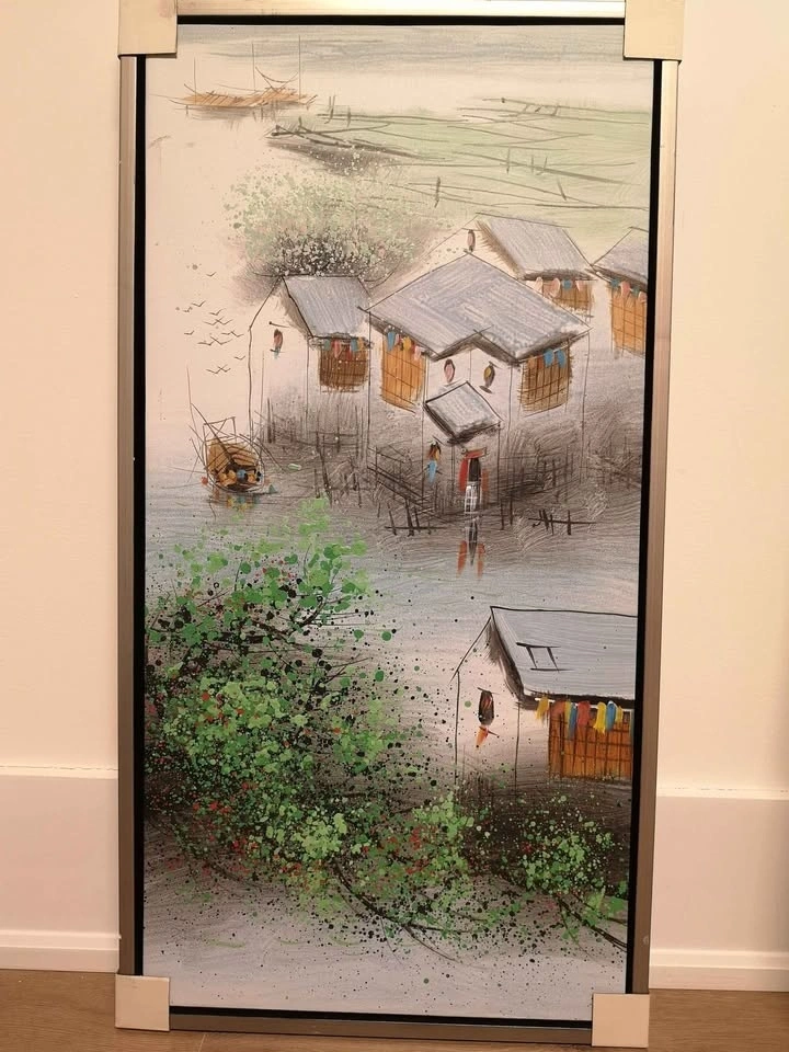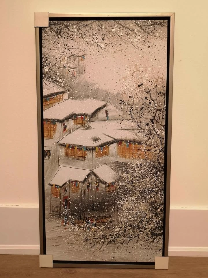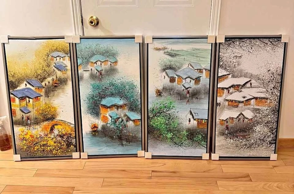Beautiful set of 4 traditional Chinese landscape paintings, representing the Four Seasons. Each artwork is framed. Elegant and timeless pieces, perfect for a living room, hallway, or office. The size of each painting is 17.5 x 33 inches. Never hung, stored carefully. Paintings themselves are in excellent condition with no damage. Only one frame has a small crack on the edge (cosmetic only, doesn't affect the artwork).