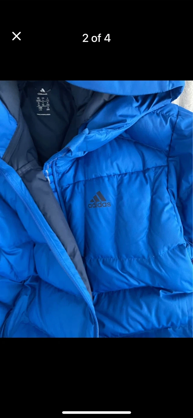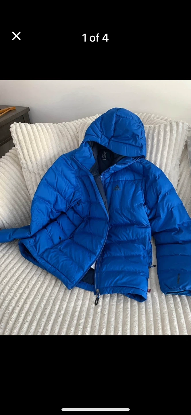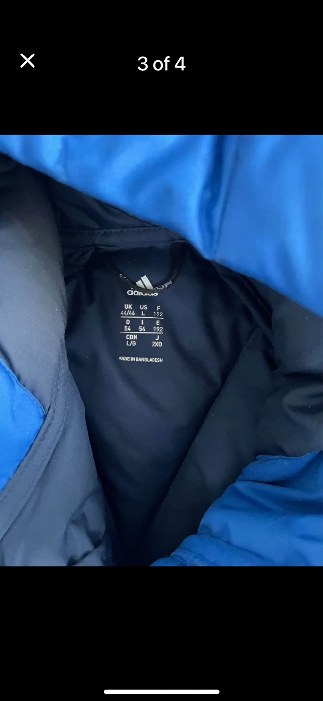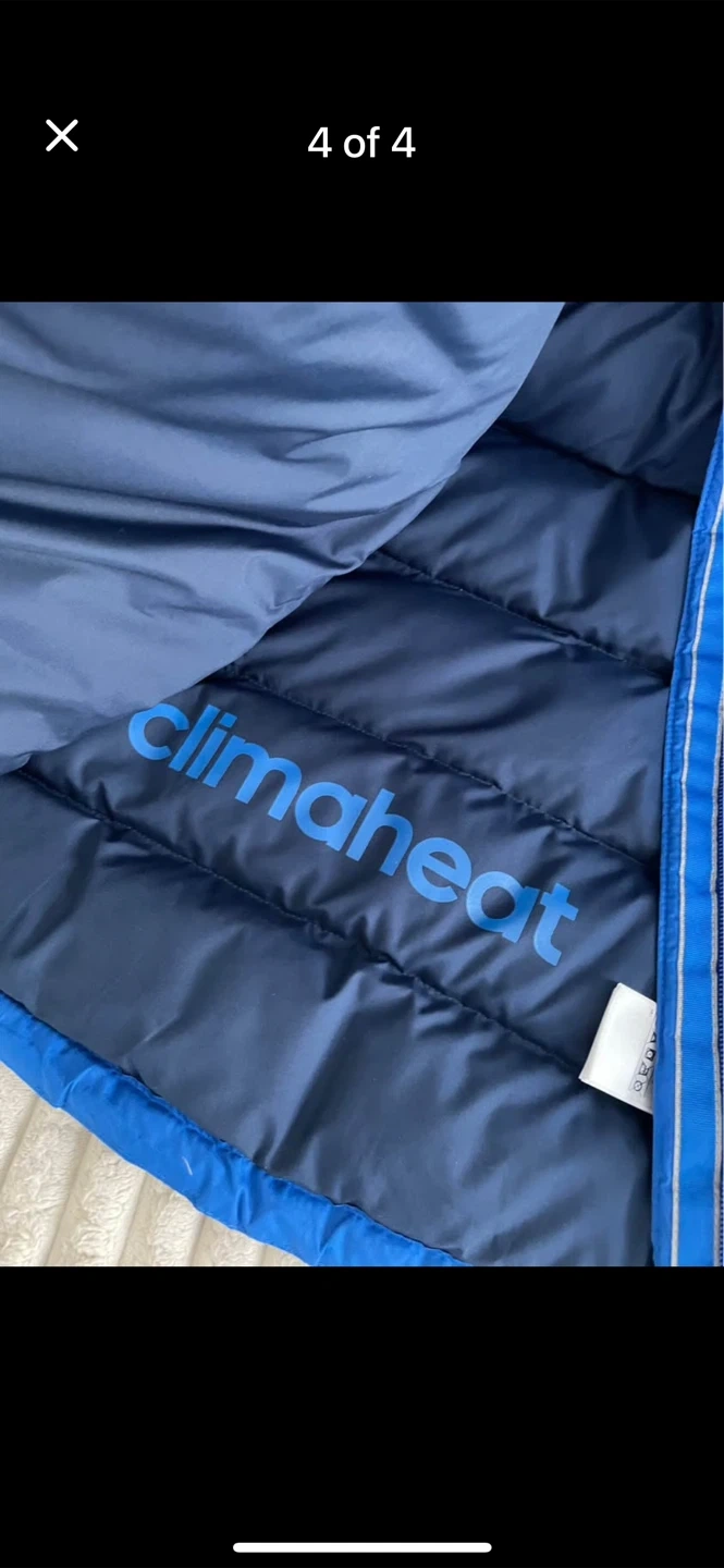 This blue Adidas puffer jacket uses Climaheat technology to keep you warm. It's a size Large and was made in Bangladesh. It's a great jacket for cold weather!