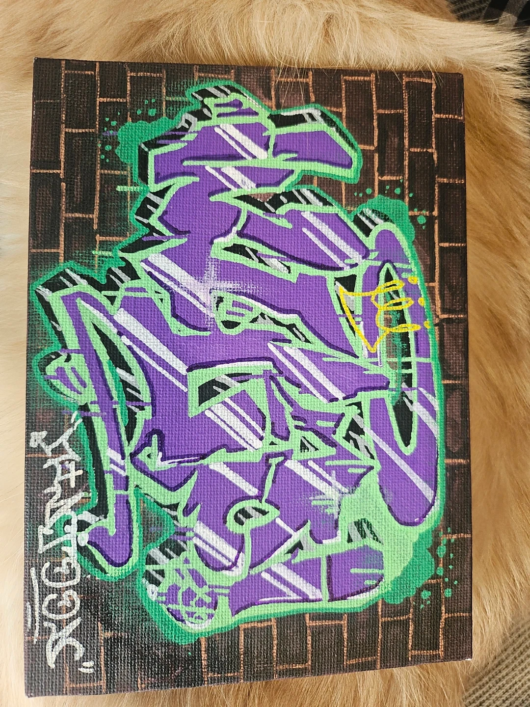 This is a vibrant graffiti art piece on canvas. It features bold purple and green lettering against a brick background. The art is unframed and ready to hang. 17.5cm×12.7xm