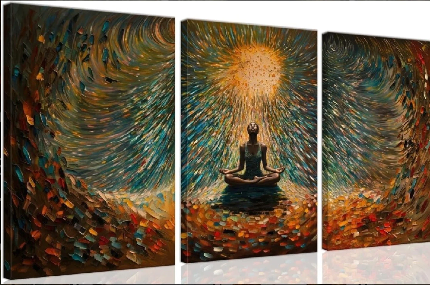 This vibrant canvas print features a person meditating with a bright, energetic background. It's a three-piece set, with each panel measuring 16 inches by 24 inches. The artwork has a solid wood frame and includes a metal hook and nails for easy hanging.