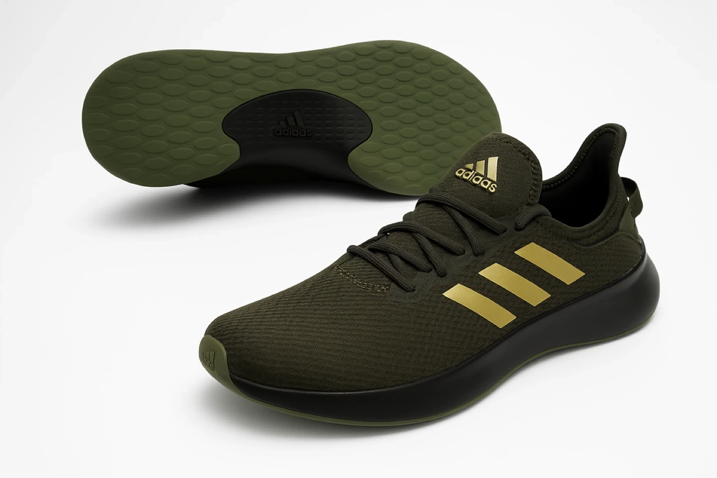 These Adidas running shoes are a stylish olive green with gold accents. They feature a breathable mesh upper and a comfortable Cloudfoam sole. Great for everyday wear or light jogs!