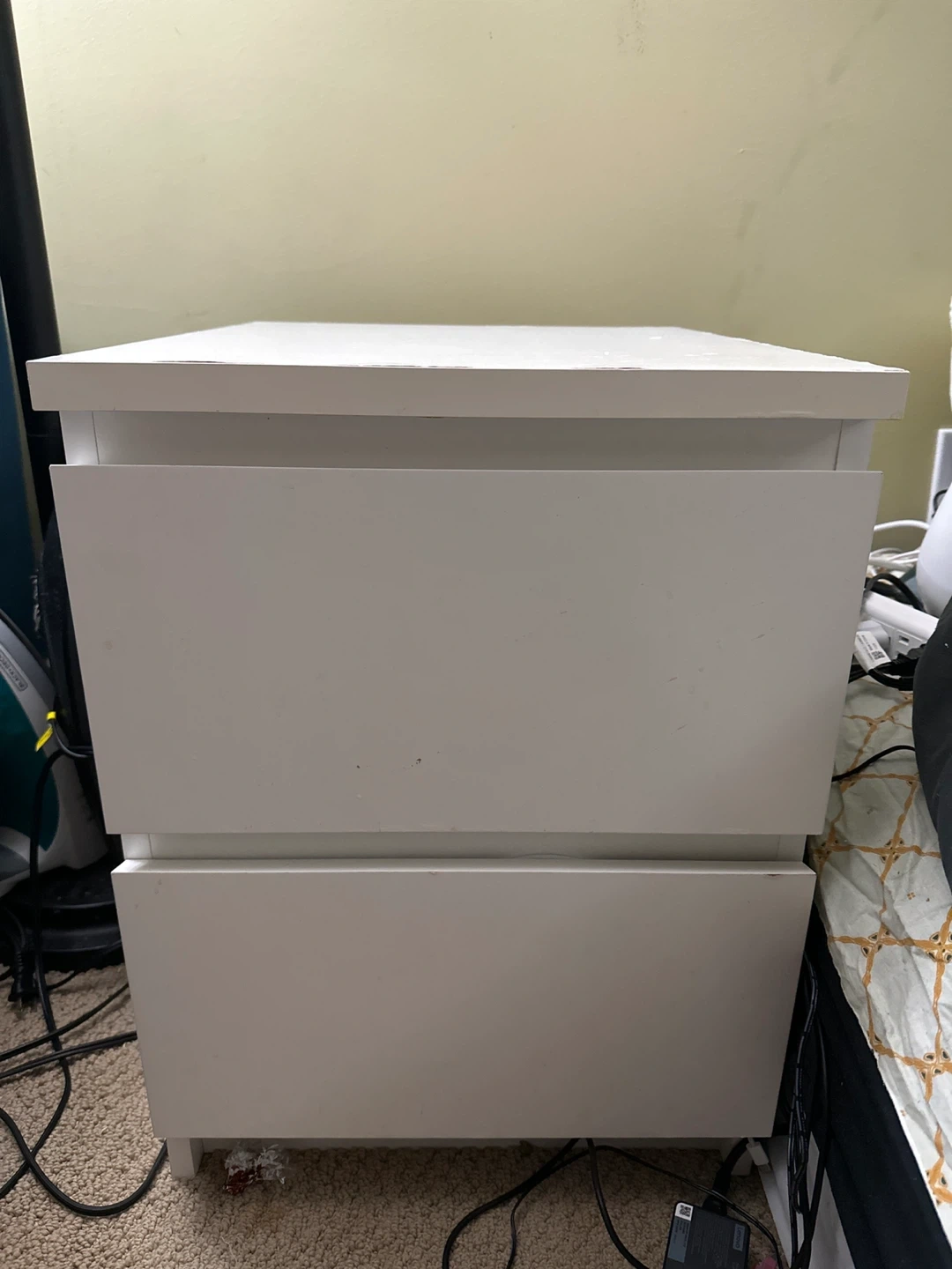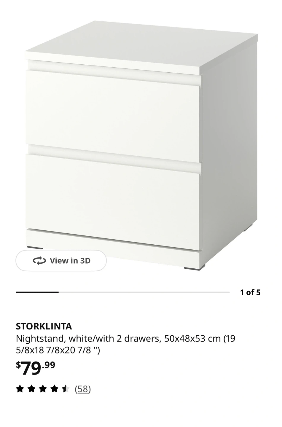 This is a white IKEA STORKLINTA nightstand with two drawers. It's 50x48x53 cm (19 5/8x18 7/8x20 7/8 "). It's a great addition for bedside storage.