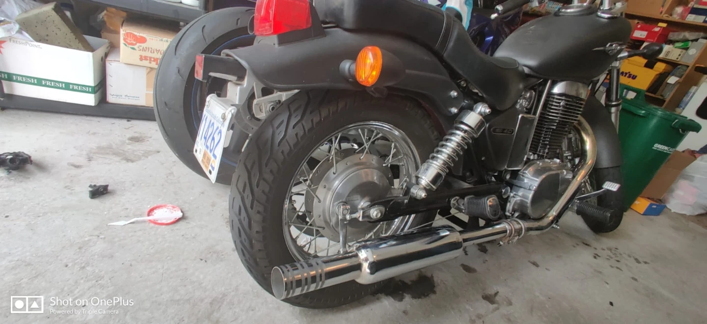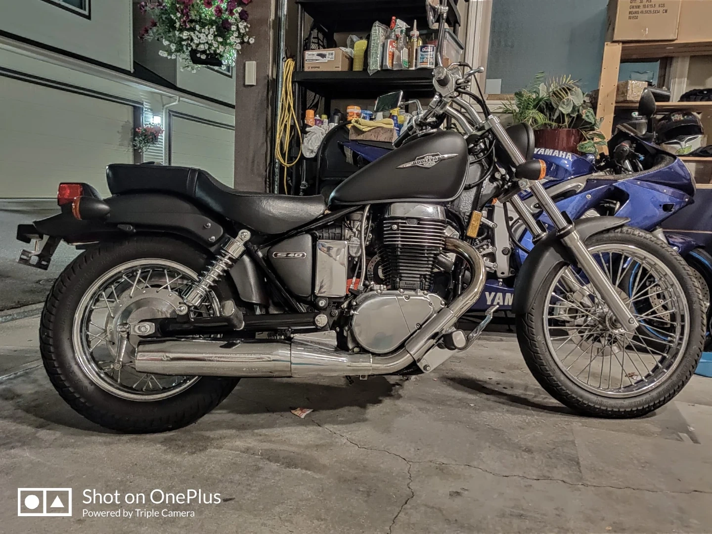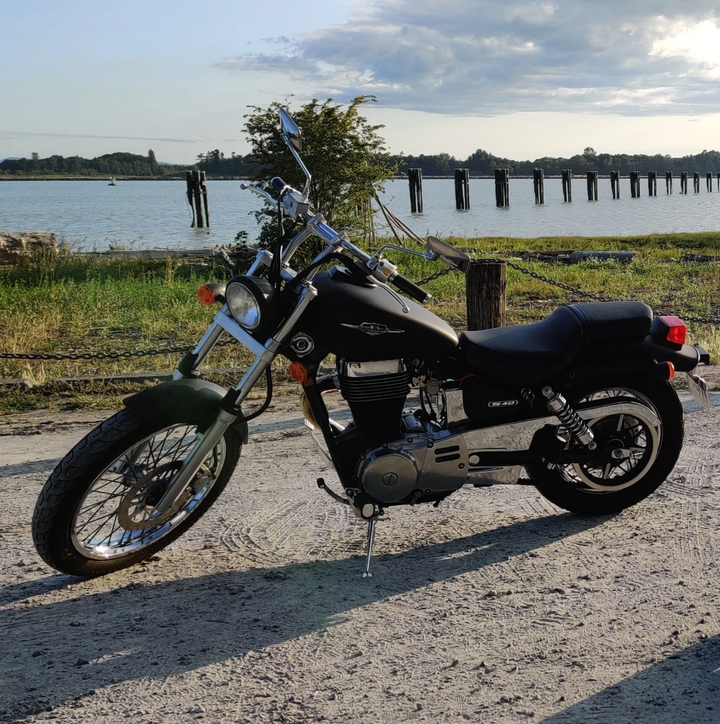 Suzuki Boulevard S40 motorcycle in black. It's a cruiser-style bike with a 652cc engine. Chrome exhaust and spoke wheels.