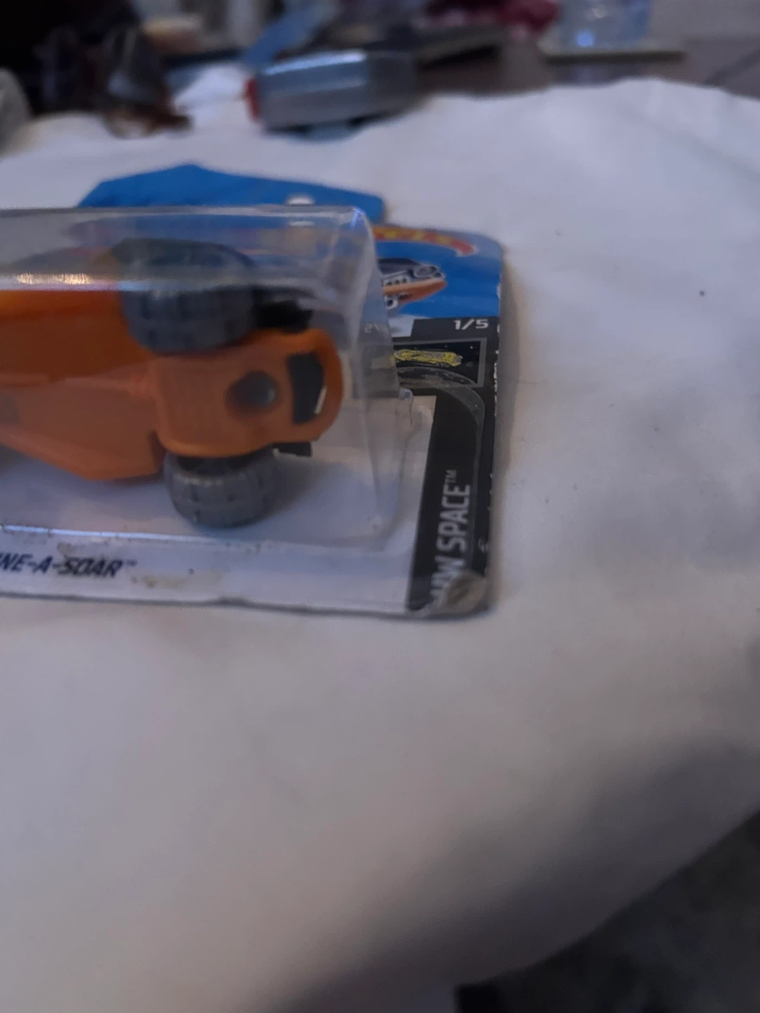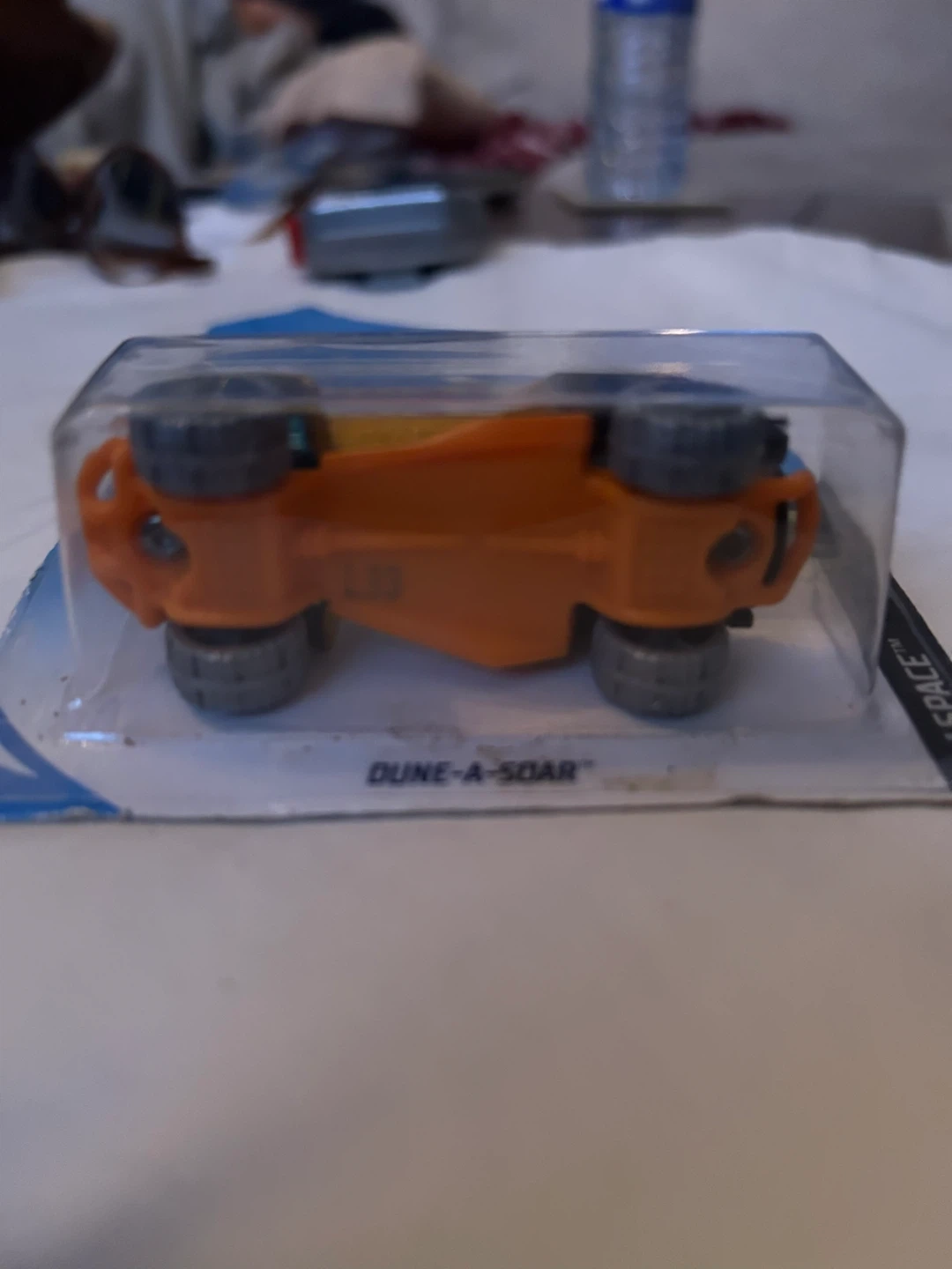 This is a new Hot Wheels Dune-A-Soar toy car in its original packaging. It's orange and gold with blue accents. Recommended for ages 3 and up.Package has some wear