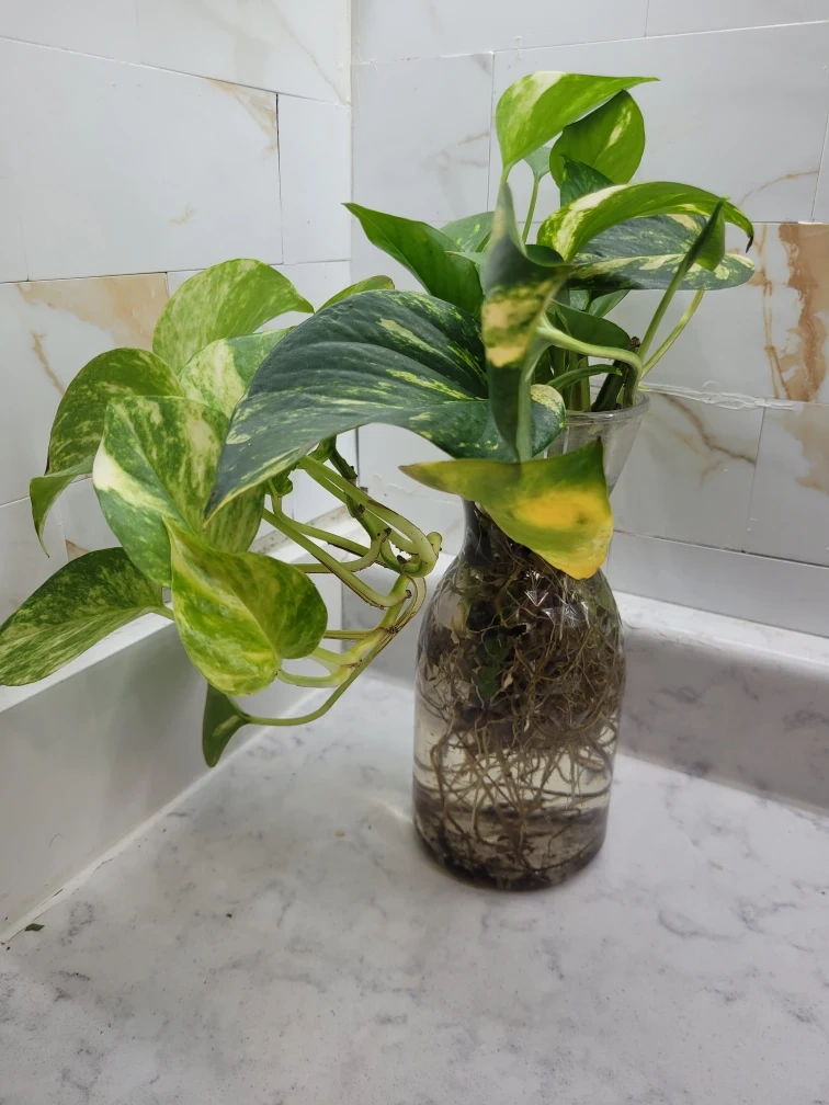 This is a healthy Pothos plant with variegated leaves, rooted in a clear glass vase. It's a low-maintenance plant that's great for adding a touch of green to any room.