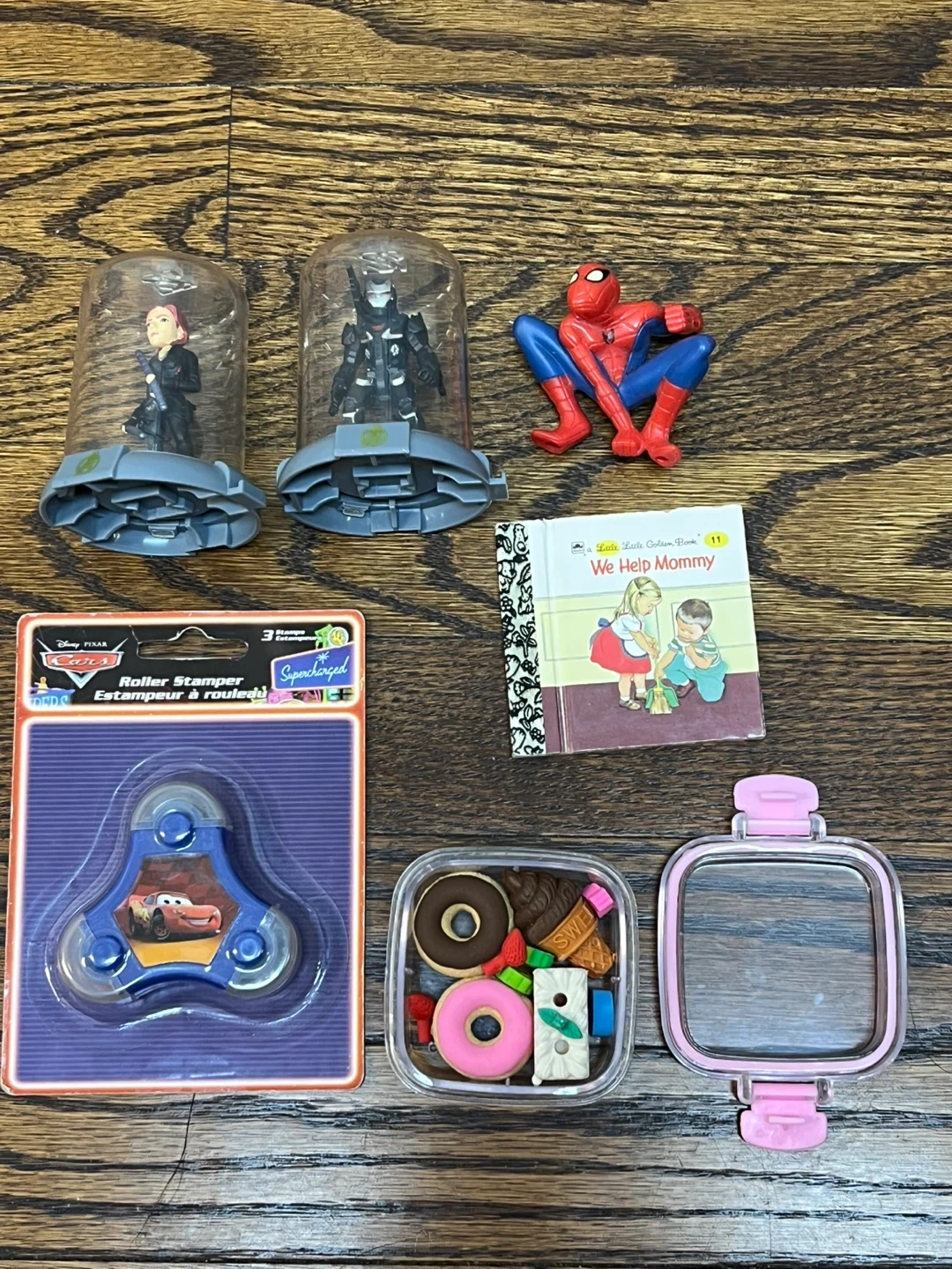 Set includes a Disney Pixar Cars roller stamper, two Marvel character figurines (Black Widow and War Machine), a Little Golden Book "We Help Mommy", a small container with novelty erasers shaped like snacks, and an empty pink container with a lid. Great for collectors or imaginative play!