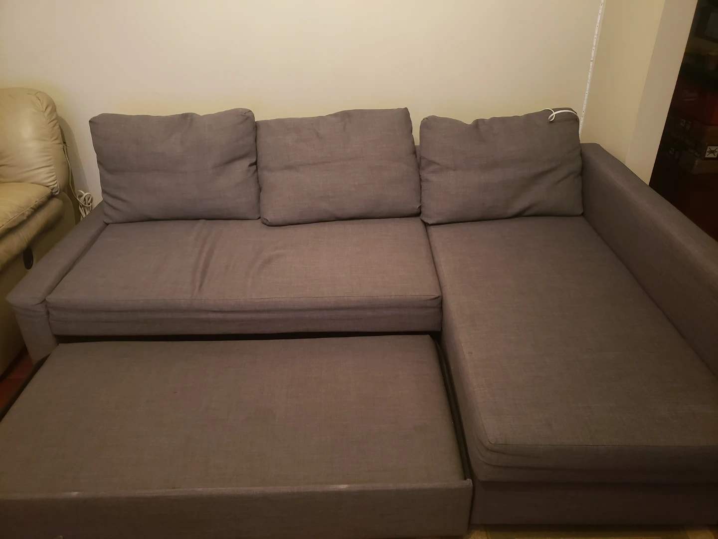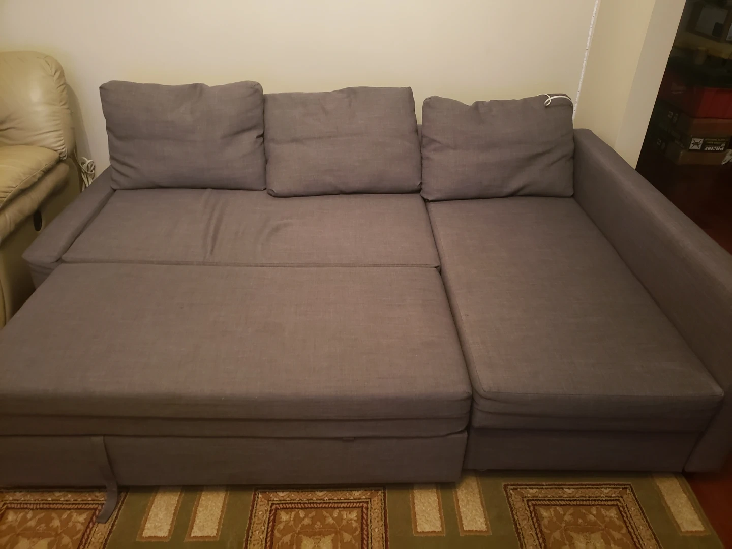 Grey L-shaped sectional sofa that converts into a bed. It has a pull-out sleeping area and under-seat storage for linens. Upholstered in a durable fabric.