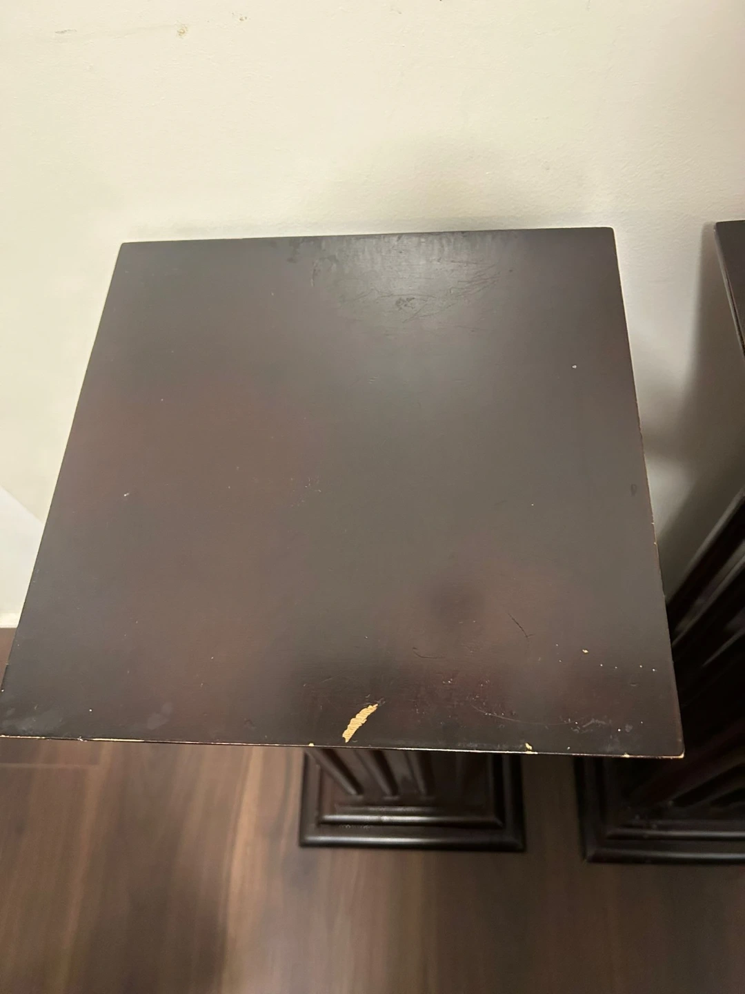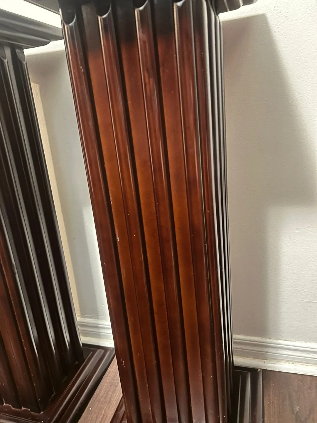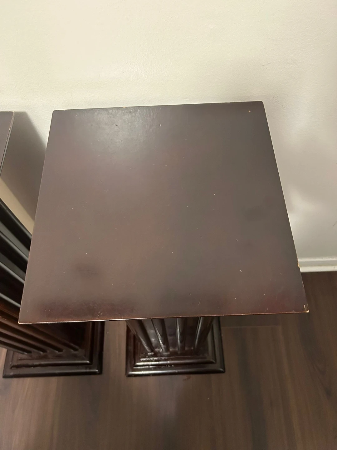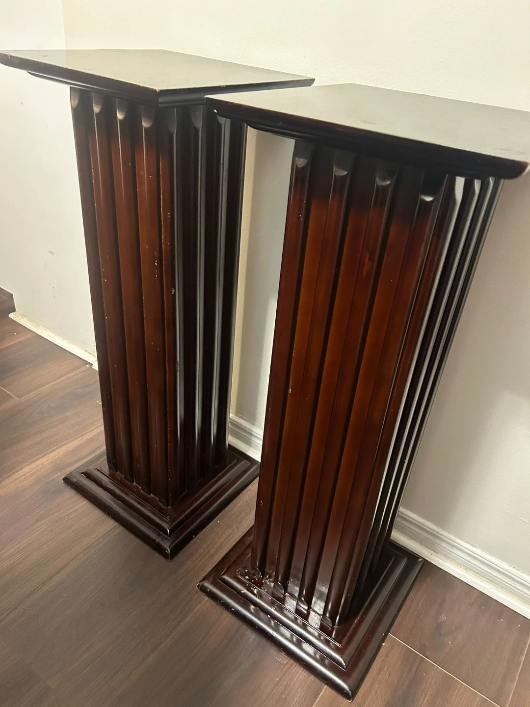 These pedestals are a dark brown colour. They have a fluted column design with a square top and base. A few minor scuffs on the top surfaces. Stand approximately 30 inches tall.