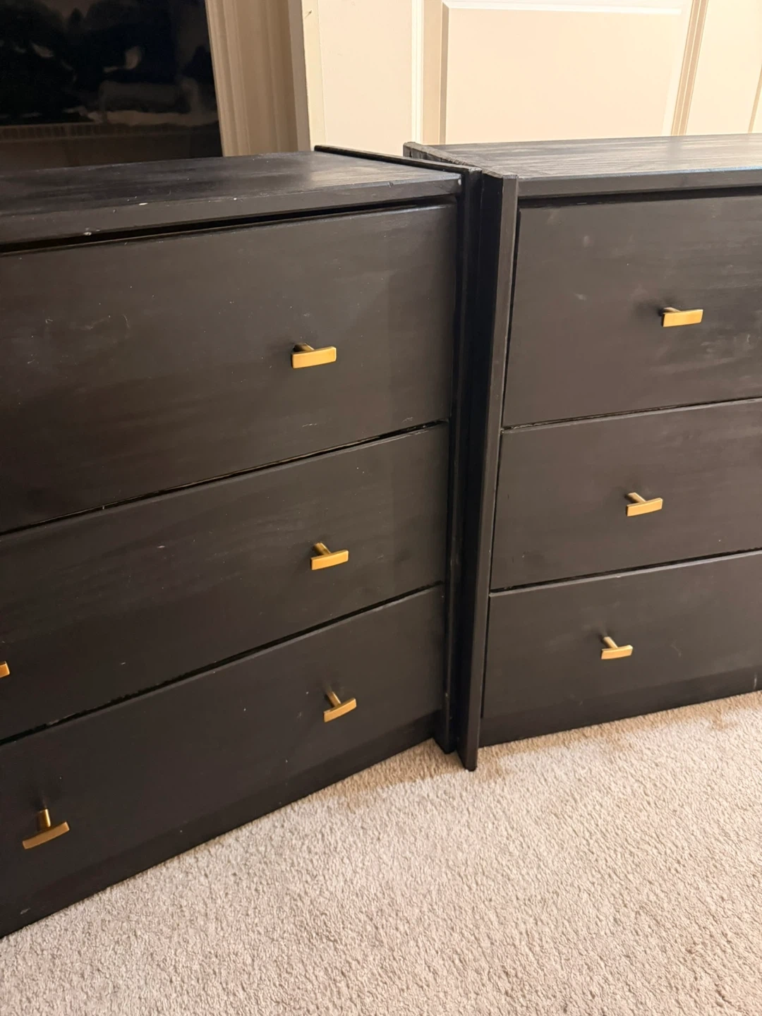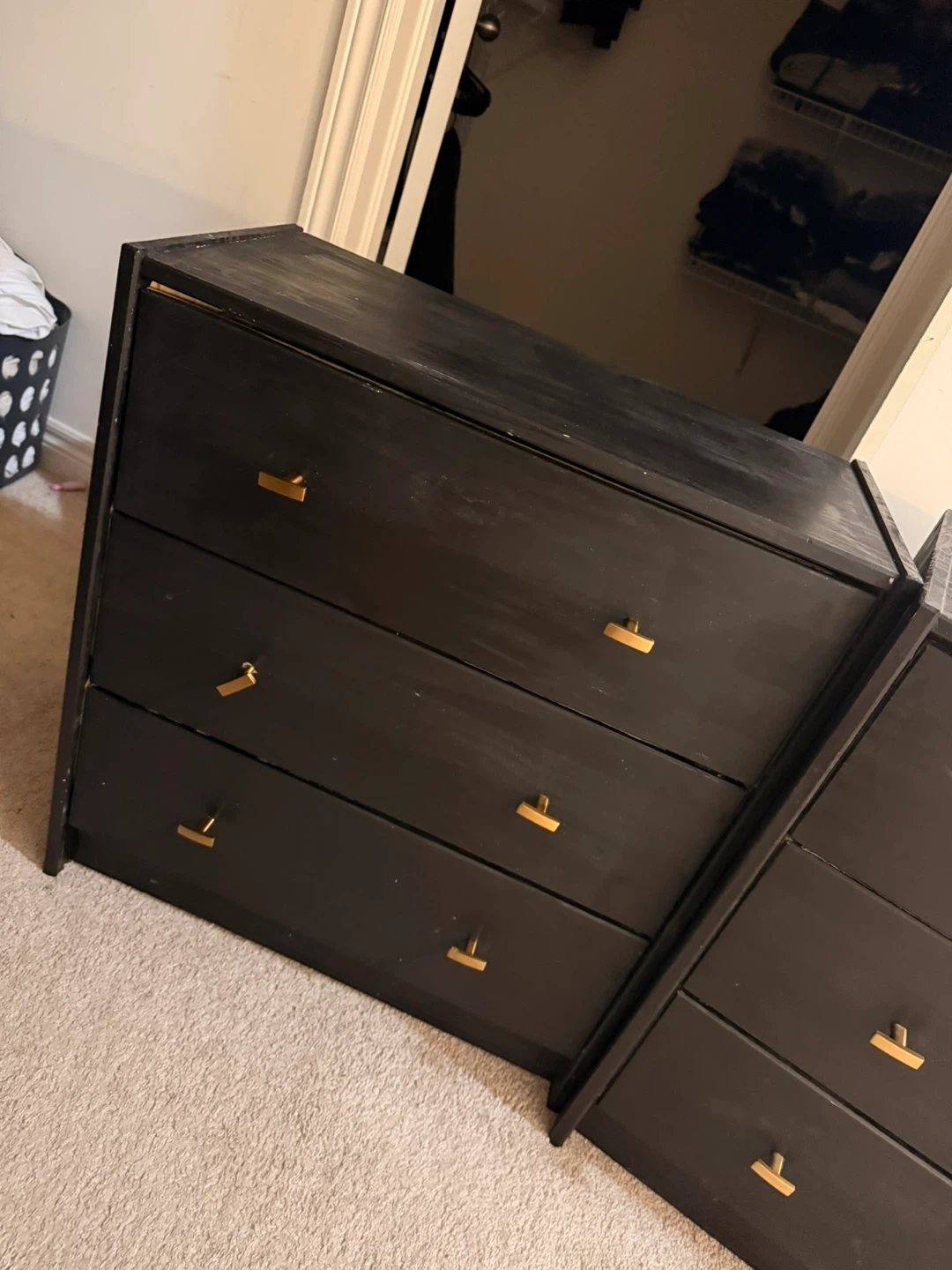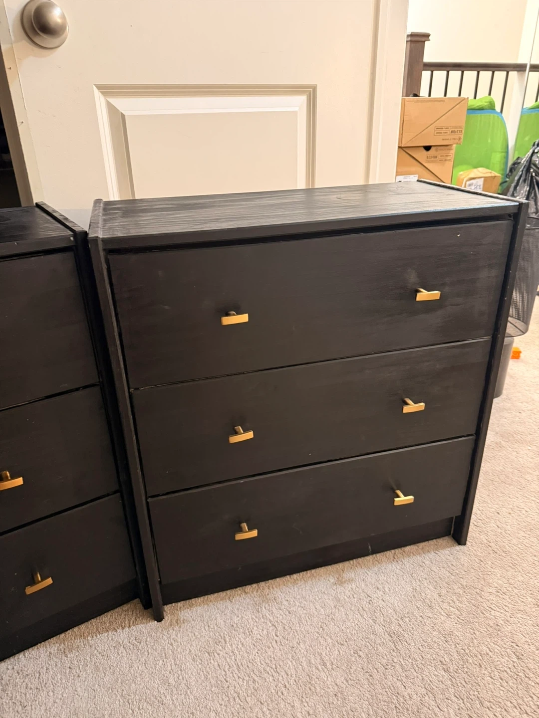 This black dresser has three drawers with modern gold handles. Its compact size makes it versatile for various rooms. Perfect for storing clothes or other household items!