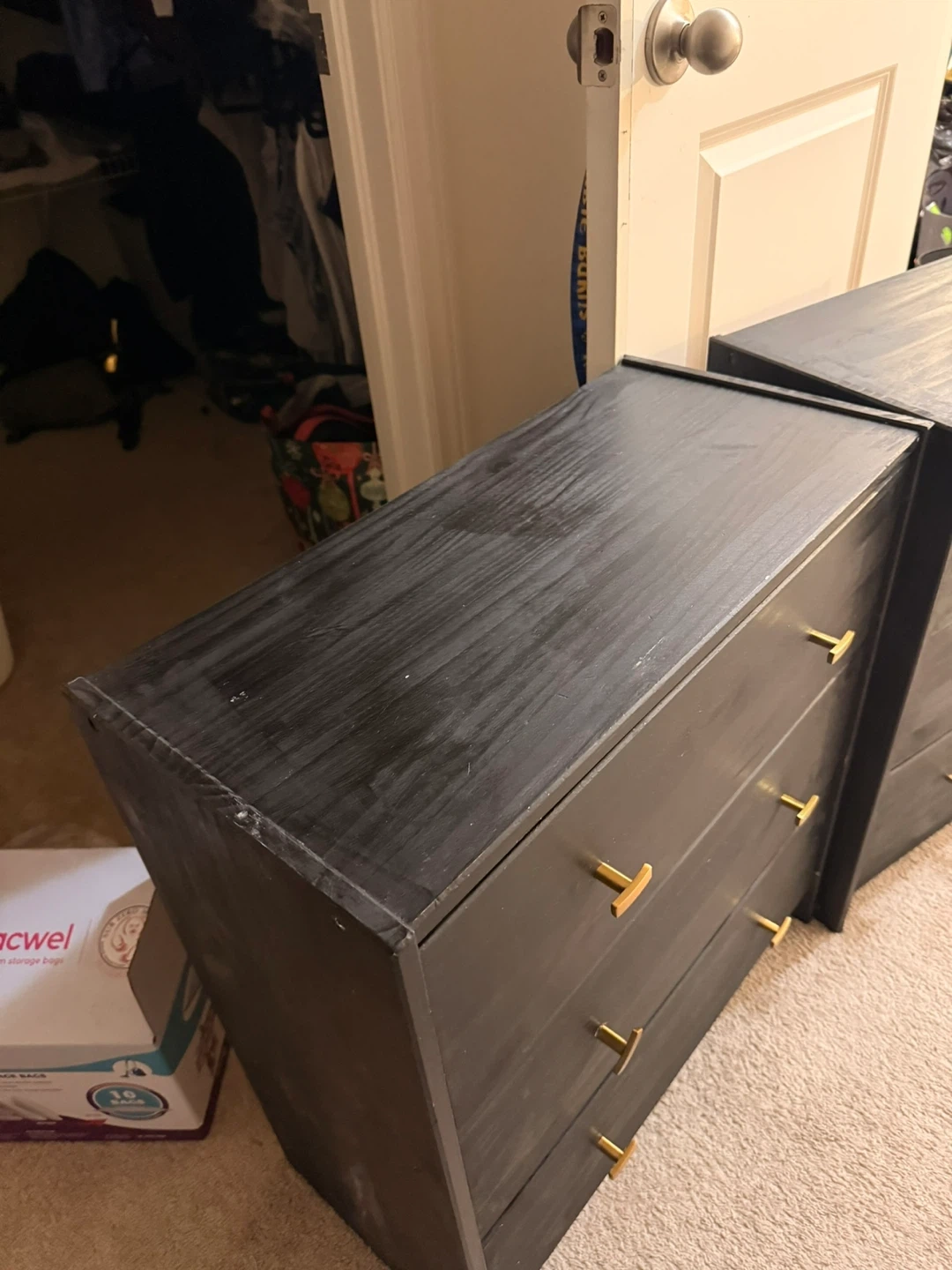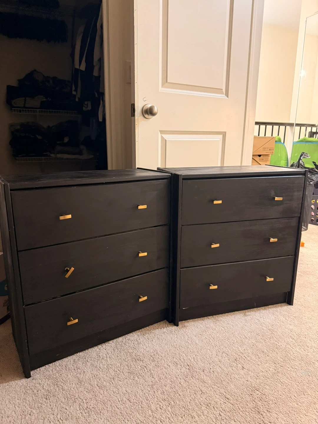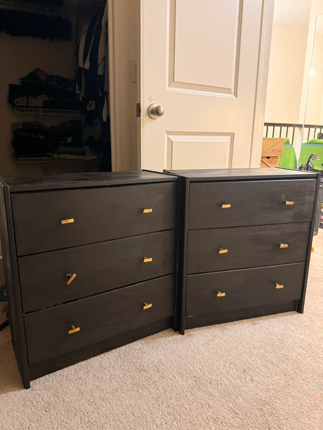 This black dresser has three drawers with modern gold handles. Its compact size makes it versatile for various rooms. Perfect for storing clothes or other household items!