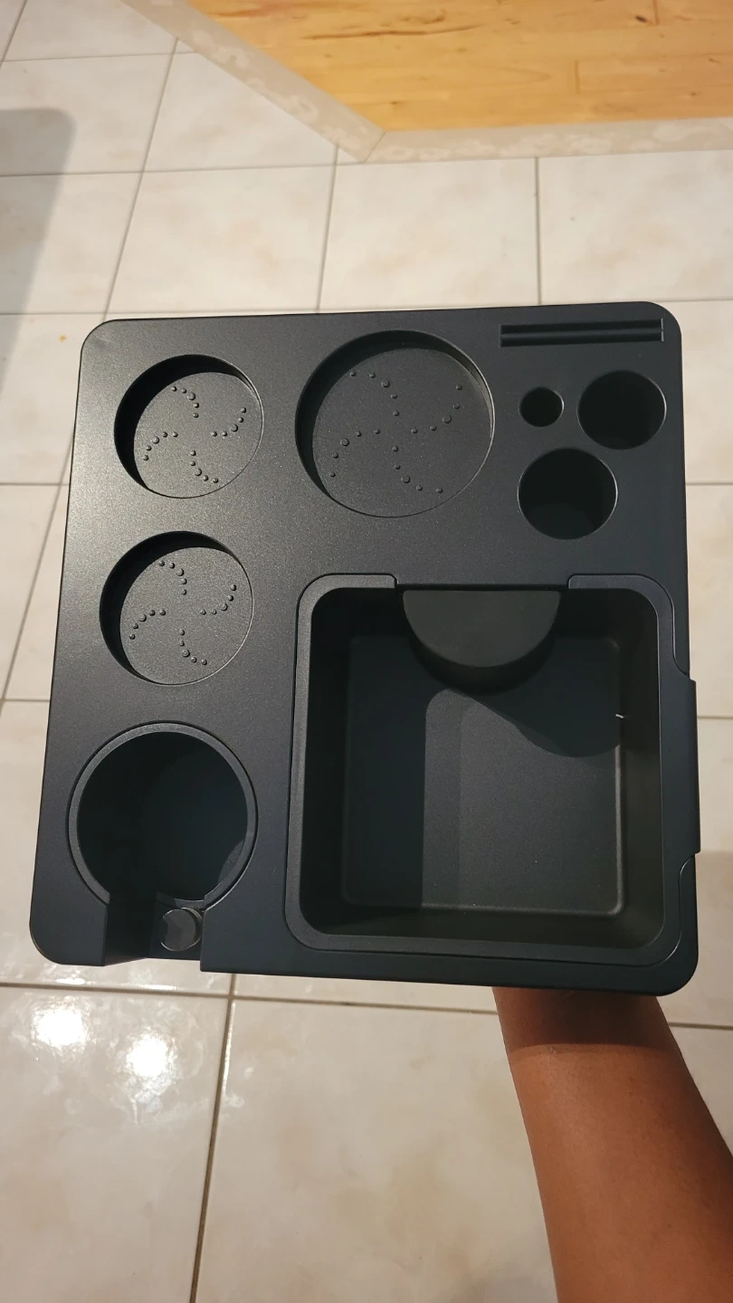 This espresso knock box station helps keep your coffee prep area tidy. It has a built-in knock box for used grounds and multiple holders for tools. It's made of durable plastic.